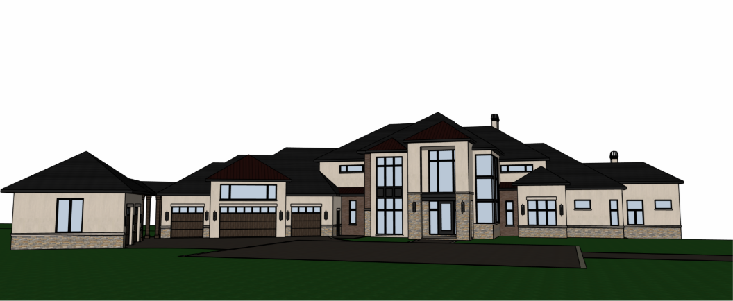 a photorealistic perspective view of an elegant residential building with white aged clay panels dark natural stone and horizontal wood planks set at sunset with clouds in the sky the interior should have soft glowing white lighting the roof should be dark gray shingles the window frames should be black metal without window grills the landscape should show large trees in the background a very large lake on the right side background a few small bushes lining the bottom of the house small trees in the foreground do not change the materials or view
