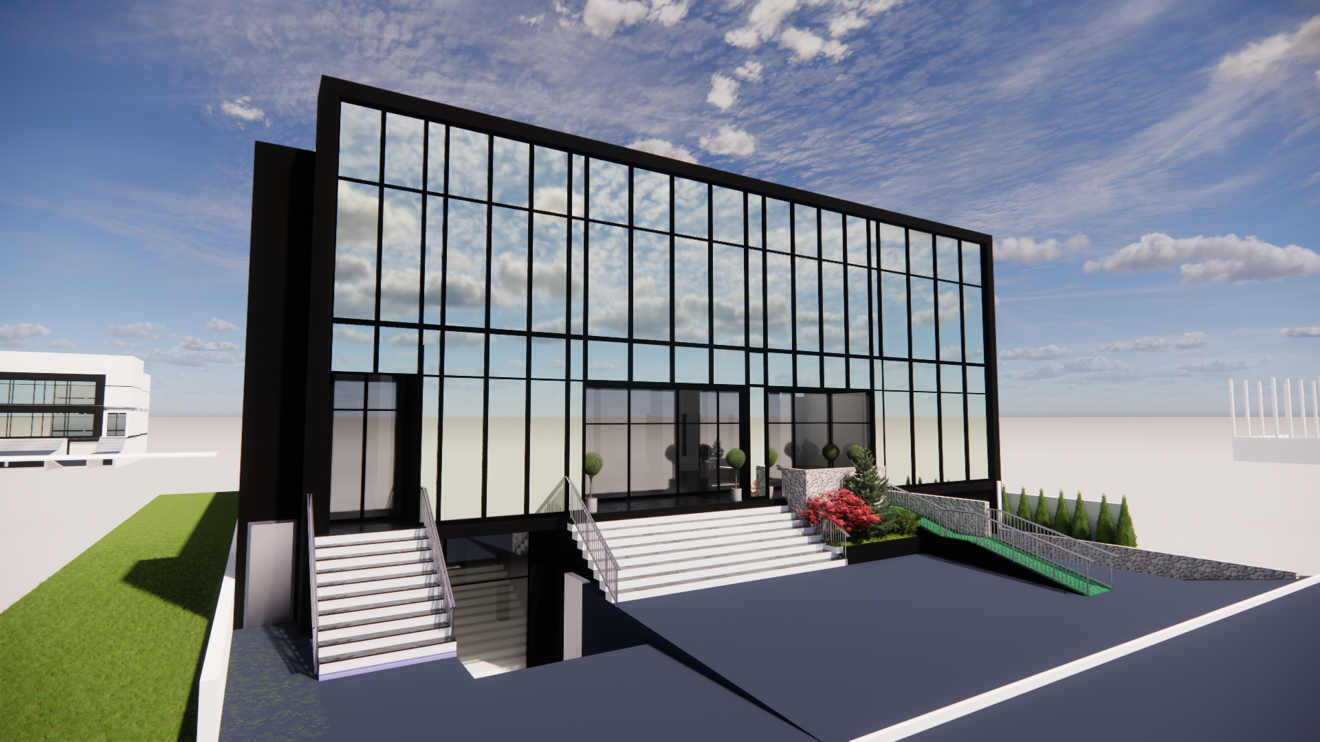 modern minimalist building large reflective glass windows with a black frame bright blue sky with soft white clouds vibrant green grass beside the white staircase stone planters with lush greenery and red flowering plants sleek white steps leading to the entrance clean open layout crisp and airy atmosphere high contrast between black and white elements contemporary cityscape