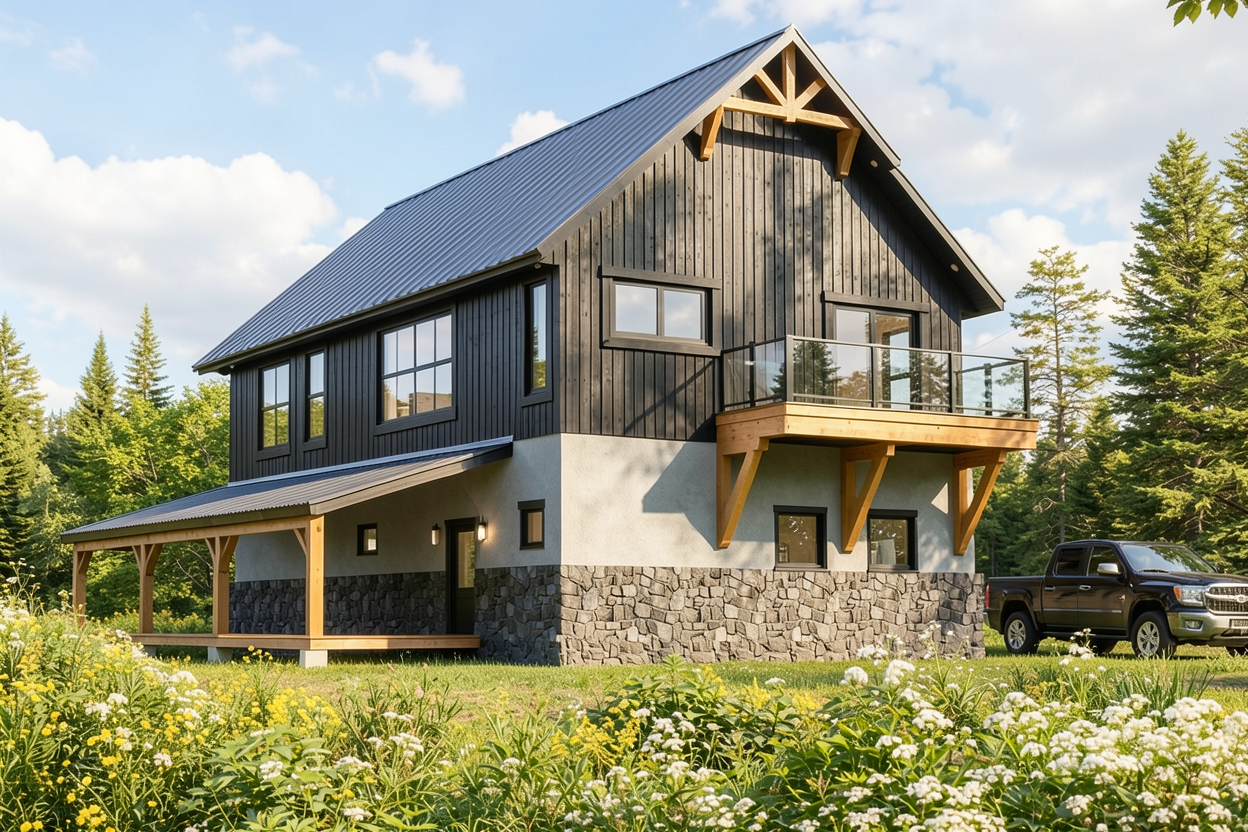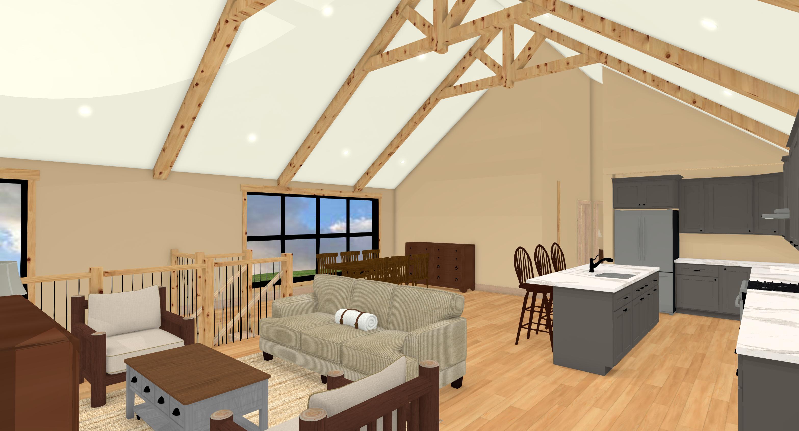 make this render look realistic stain the wood beams in the roof and the truss add some items on the table tops add some modern paintings to the walls