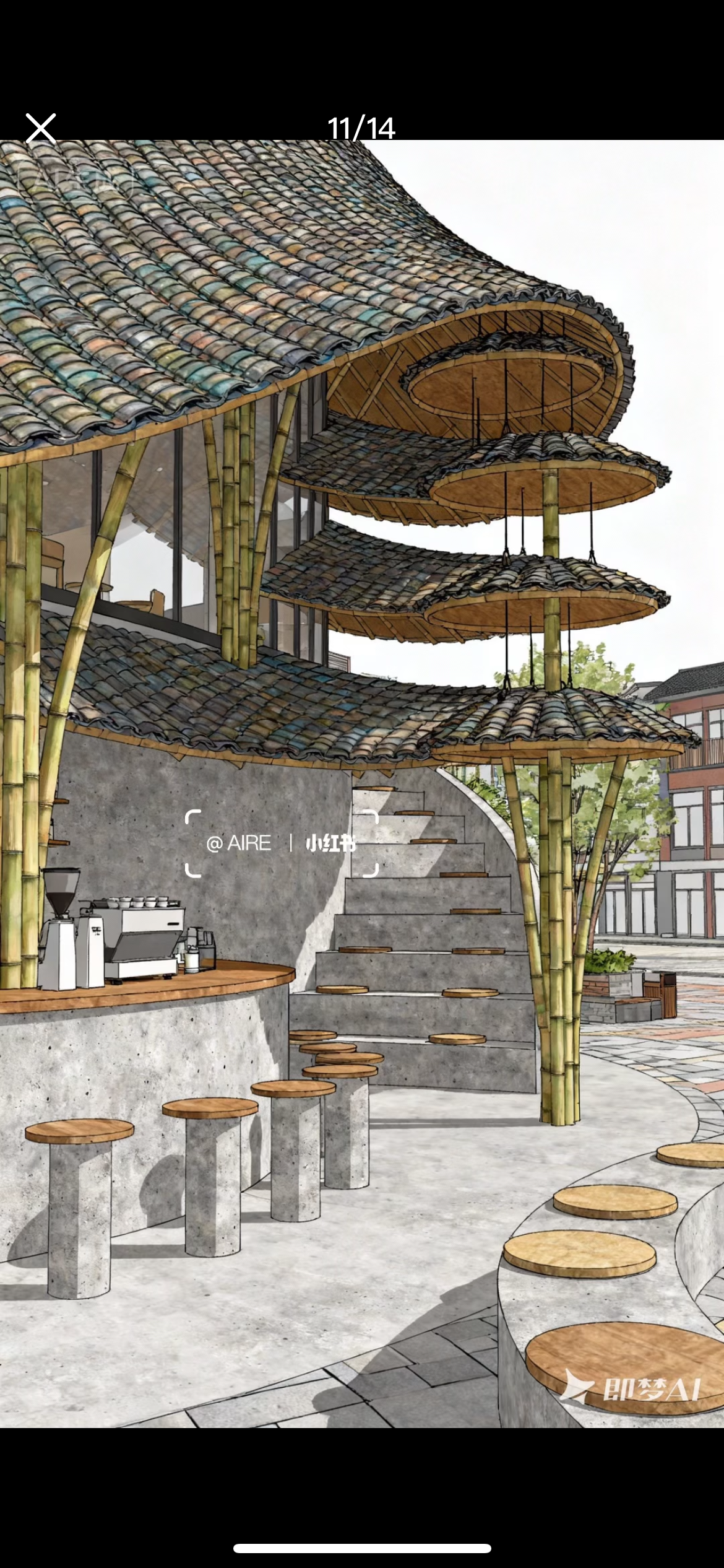 zaha hadid close up shot render this to make it seem more realistic keep the materials as wooden and nature style make the roof very abstract looking with a chinese traditional architectural style add more open space area and void add more greenery architecture