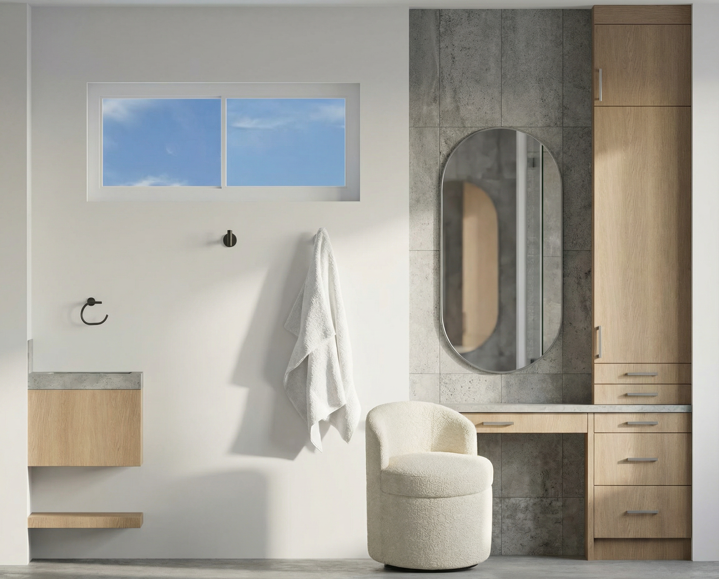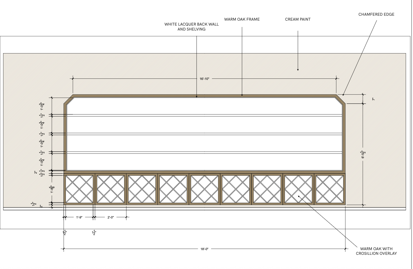this is a built in at the violet grey store can you please create a realistic rendering remoe words those are just details for you to execute please fill in the botom cabinets are all wood with the crosilion detail the shelving and inset is all a lacquer white cream