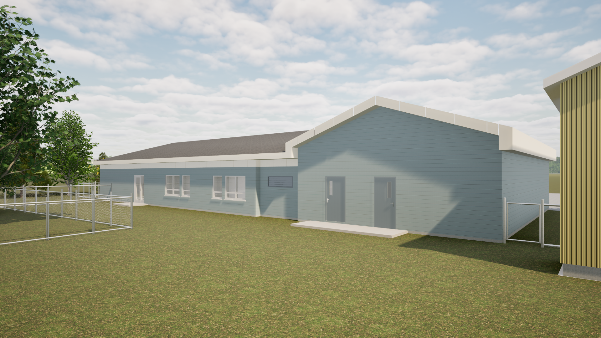 realistic architectural render childcare center yard add proportionnal kids playing in the yard 6 kids 1 adult do not change any colors no flower in the grass lawn grass blur the kids