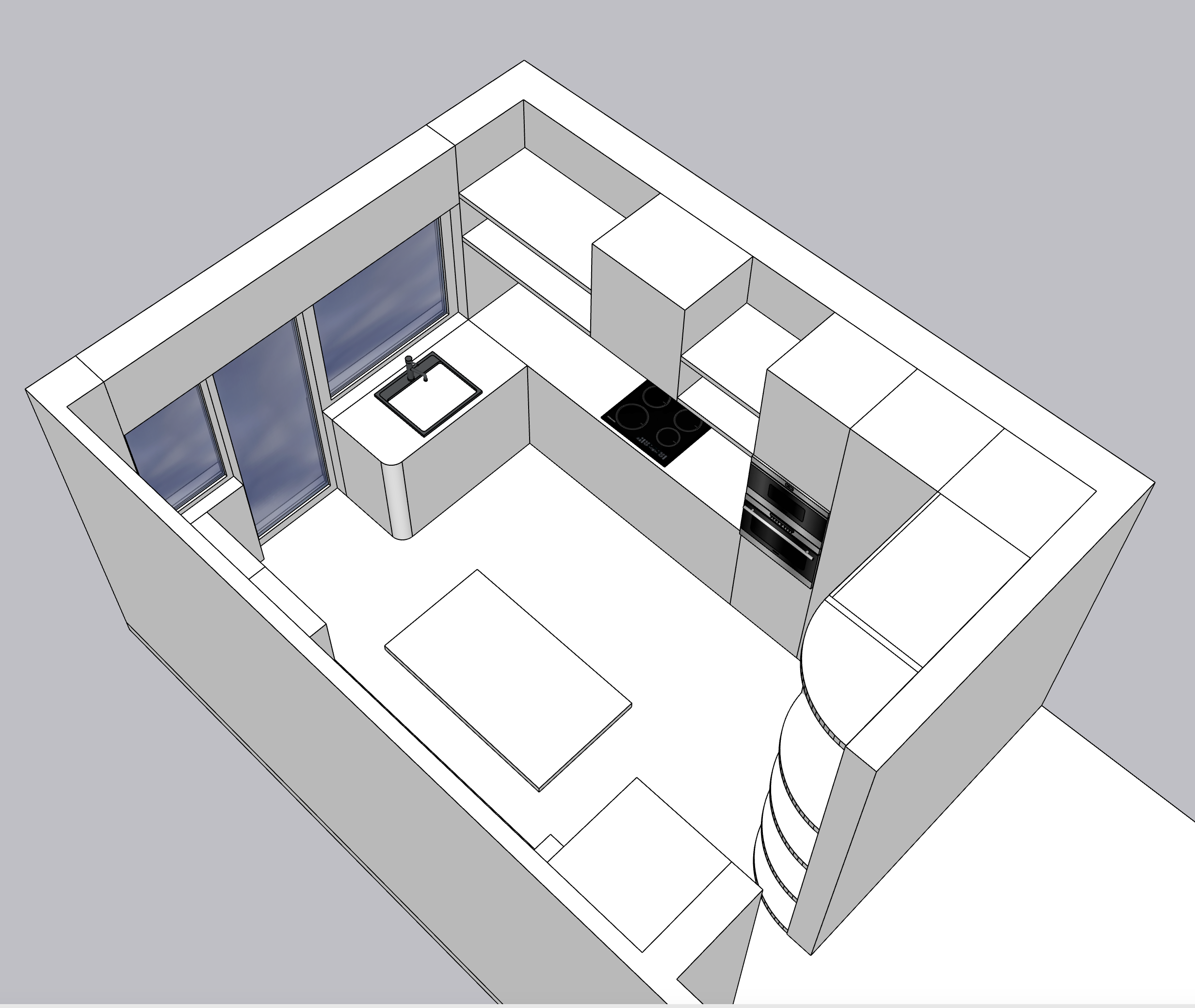 render this 3d model cabinets old rose countertop beige dekton black faucet and sink grey micro cement floor light wood table black handles