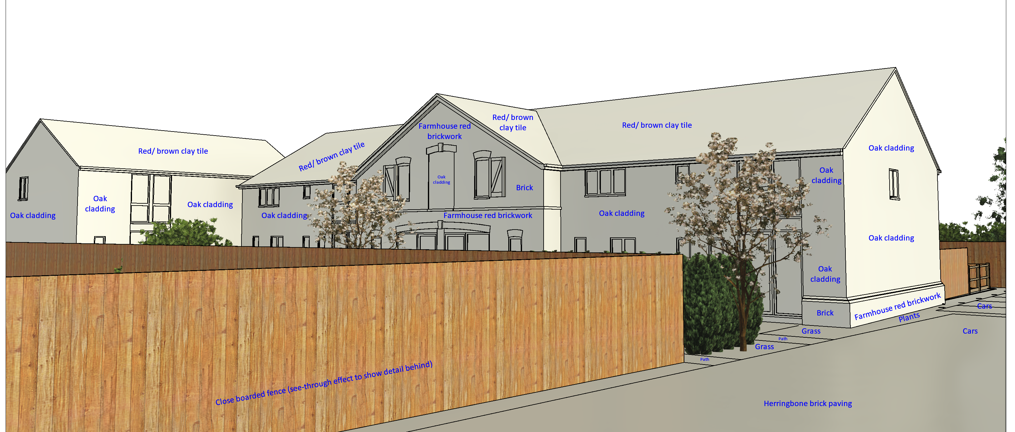 please create a realistic render of these buildings there is a farmhouse red brick plinth around the base of the walls with horizontal oak cladding above the plinth the central gable of the large main building is all brickwork with oak cladding in the central first floor dummy opening all window and door frames are black aluminium the shutters on the central first floor windows are black timber