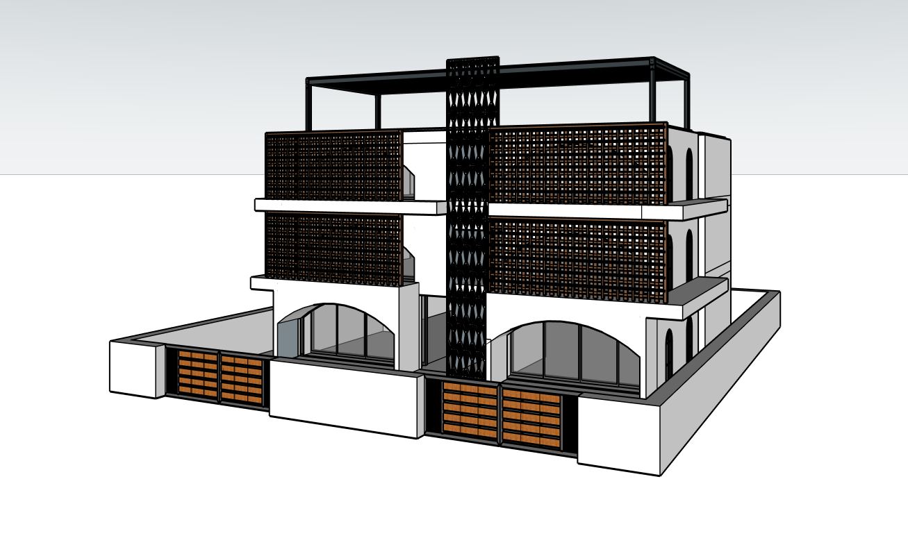 use the sketchup screenshot as a loose reference for general scale and footprint but reimagine the building as a luxurious 3 floor apartment complex in djibouti elevate the massing with elegant volumetric shifts terraces and refined proportions design the facade using high end materials like natural stone travertine smooth stucco and bronze or black metal accents feature large floor to ceiling windows shaded private balconies vertical fins or louvers for sun control and lush rooftop or terrace greenery highlight landscaped entrance areas ambient pathway lighting and modern exterior furniture the environment should include palm trees tropical plants and clean urban pavement realistic midday lighting with sharp shadows soft reflections on glass and a warm elegant ambiance ultra detailed cinematic realism with high fidelity and rich architectural textures the shot is set at in late afternoon