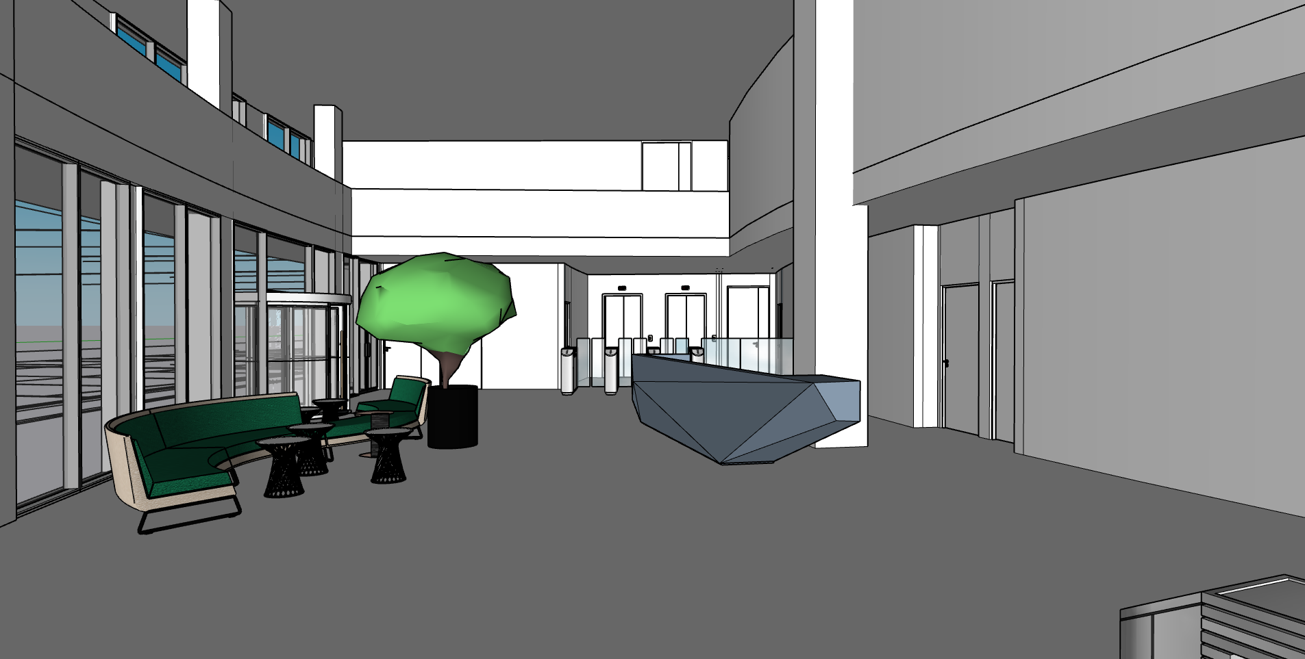 reception hall of a building modern reception desk designer lighting marble flooring aeronautical shapes