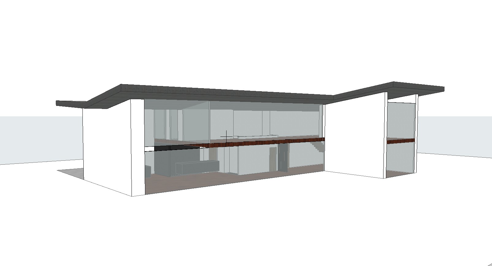 modernist exterior shot modern farmhouse villa immersed in greenery inspired by traditional rural architecture clean volumes with pitched roofs natural materials and large floor to ceiling glass windows strong indoor outdoor connection minimalist contemporary design warm neutral tones surrounded by trees and landscaped vegetation soft natural light calm and elegant atmosphere architecture