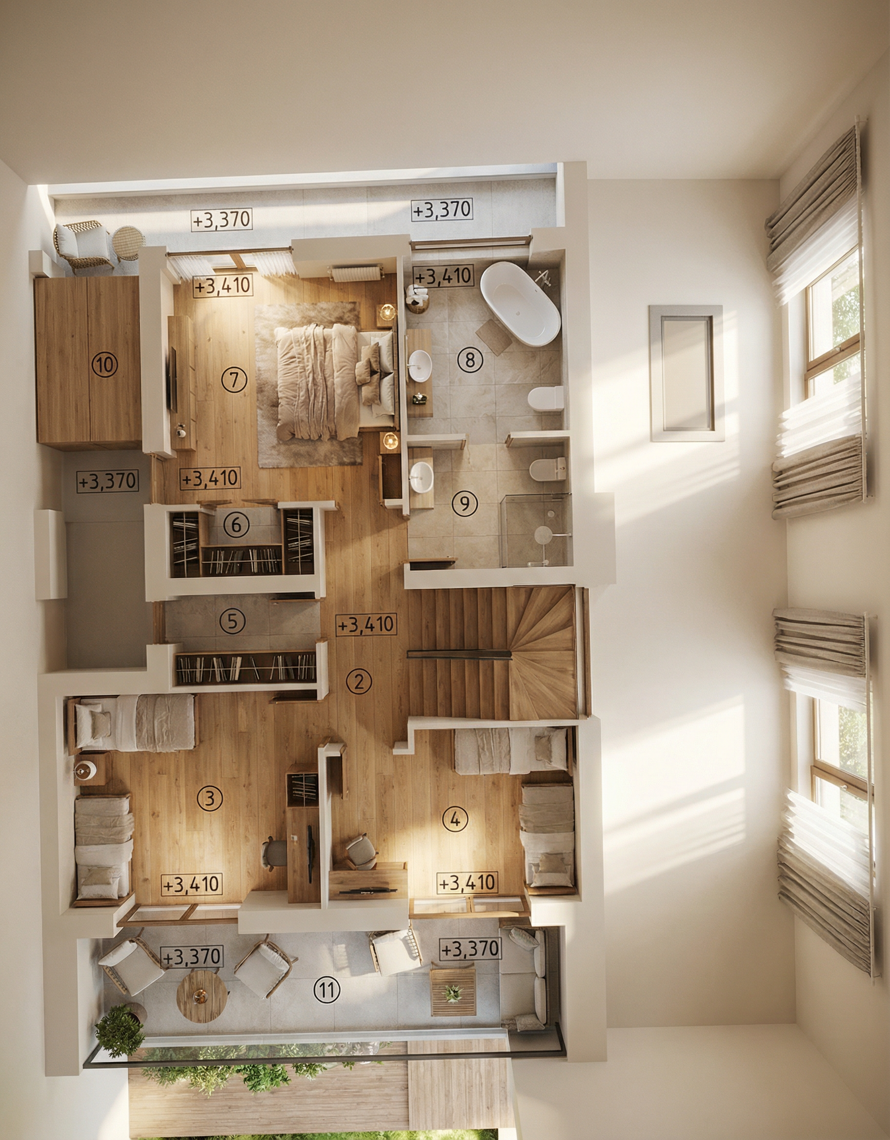 render a top view of rhe cafetaria layout use earthy tones for the wooden floors and tables the chairs are wallnut wood the walls are painted in soft cream complementing the light curtains the overall ambiance should feel welcoming and stylish
