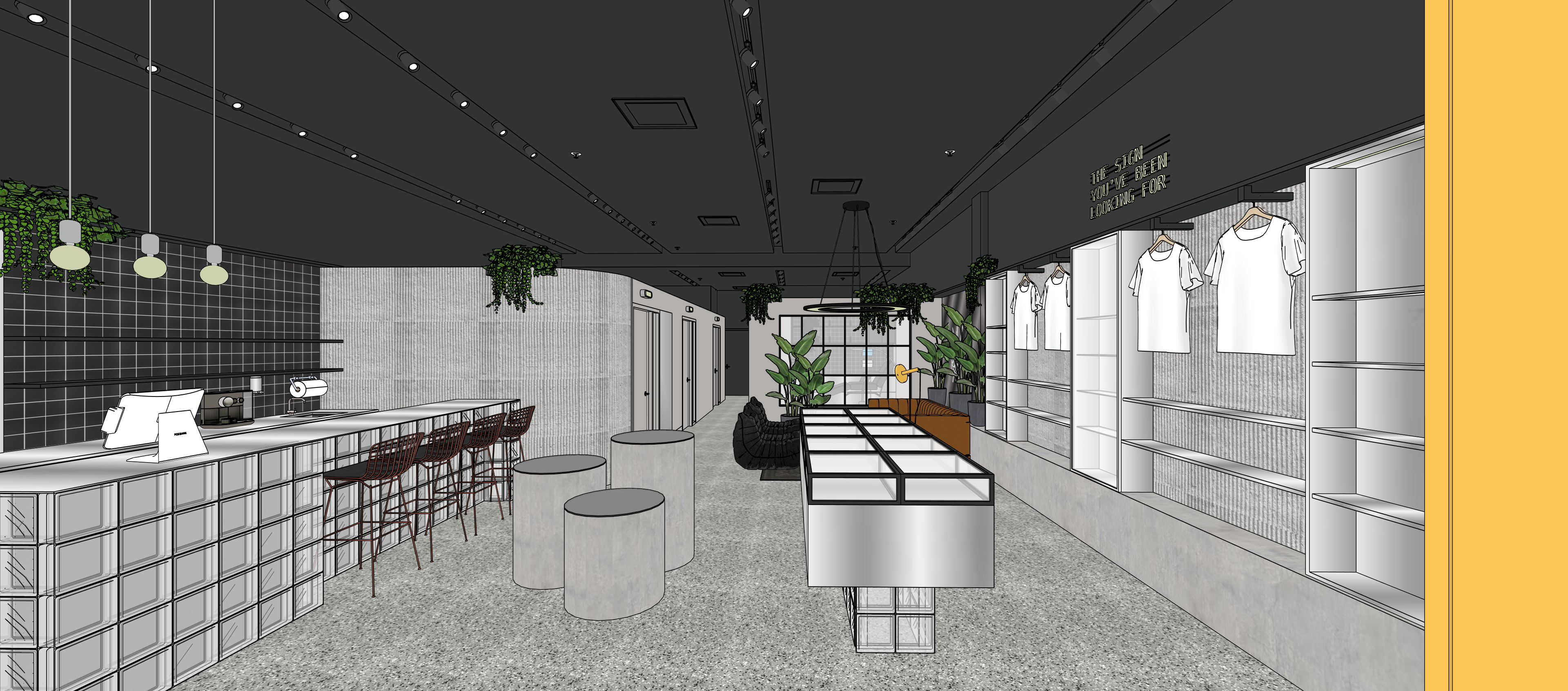 keep colors and style like image i sent keep image angle on the left we have glass bloc counter with a brushed stainless steel top the black tile is glossy middle showcase glass casing on top with bottom stainless steel on glass blocs the 3 cylinders are in concrete with mirror tops right side has the letters on the wall are led light the cabinet under matte brushed stainless steel on top of a concrete base