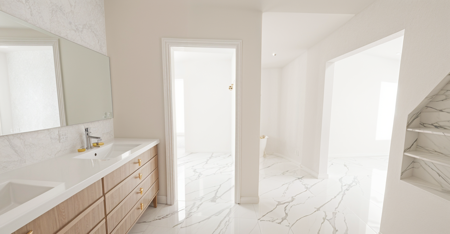 remove the item on the countertop clean the stone stage the countertop and floating shelves with modern mountain decor and accessories remove the cord that is hanging down from the shelf and remove the coffee cup on the step