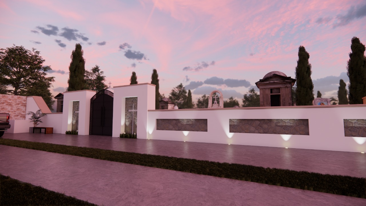 modern exterior shot render a serene cemetery entrance at sunset capture the softly lit pathway and wall washed with warm golden lighting against the white stucco highlight the textured stone inlays with deep grays incorporate tall lush cypress trees and green shrubs for contrast set against a sky painted with pastel pink and soft blue hues dotted with scattered clouds convey a tranquil and peaceful atmosphere architecture