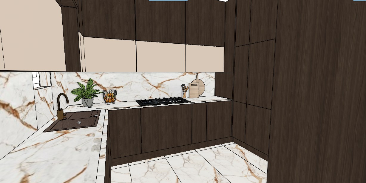 reate a realistic high quality interior render with abundant natural daylight the scene should be illuminated by bright warm sunlight entering through windows the lighting should feel soft yet vibrant creating natural shadows and a fresh daytime atmosphere outside the windows include a lush green view with trees and foliage suggesting a sunny day in spring or summer the greenery should appear vivid and slightly sunlit enhancing the connection between the interior and nature the overall mood should feel airy calm and inviting with clear daylight tones and realistic light reflections on surfaces avoid artificial lighting dominance natural sunlight should be the primary light source the led lighting recessed into the bottom of the upper cabinet runs along the entire length do not change the colors correct the bottom of the kitchen cabinet and the marble cladding in the image
