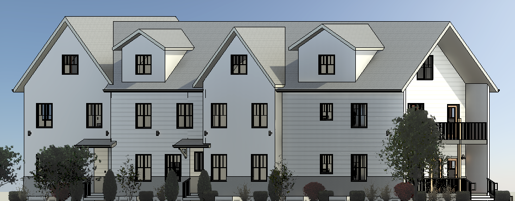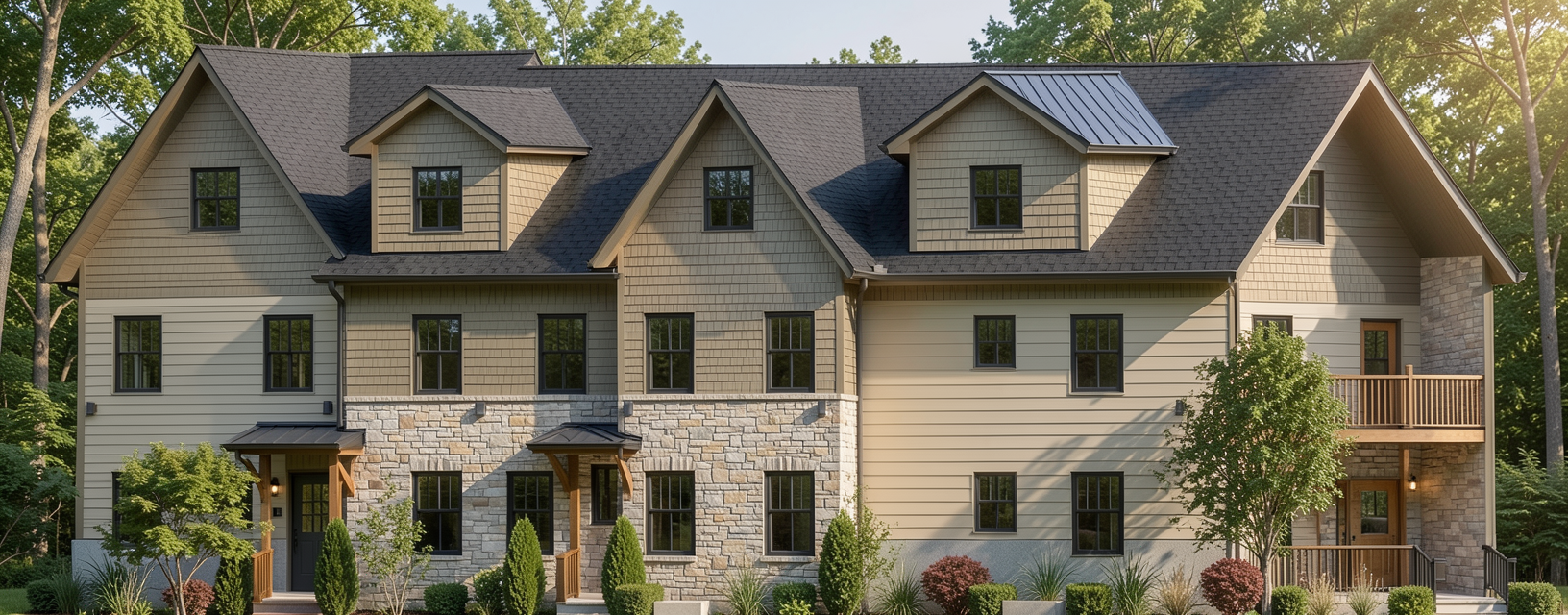 make this elevation photorealistic while keeping textures and architectural elements the same as selection add professional landscaping on an urban lot with a student housing scene with good lighting that is in minneapolis mn use the following colors and materials board and batten siding to be 62615c in color shake siding to be 62615c in color siding corner boards to be 62615c in color stone veneer wainscoat to be provia limestone buff shingle roofs are to be black hdz dimensional shingles entry roofs to be black standing seam metal gutters are to be dark gray in color windows to be black in color fascia soffit to be metal gray in color entry door to be glass 6 lite door painted 323132 in color porch columns to be stained sherwin williams woodbridge sw 3504queen accent trusses to be stained sherwin williams woodbridge sw 3504