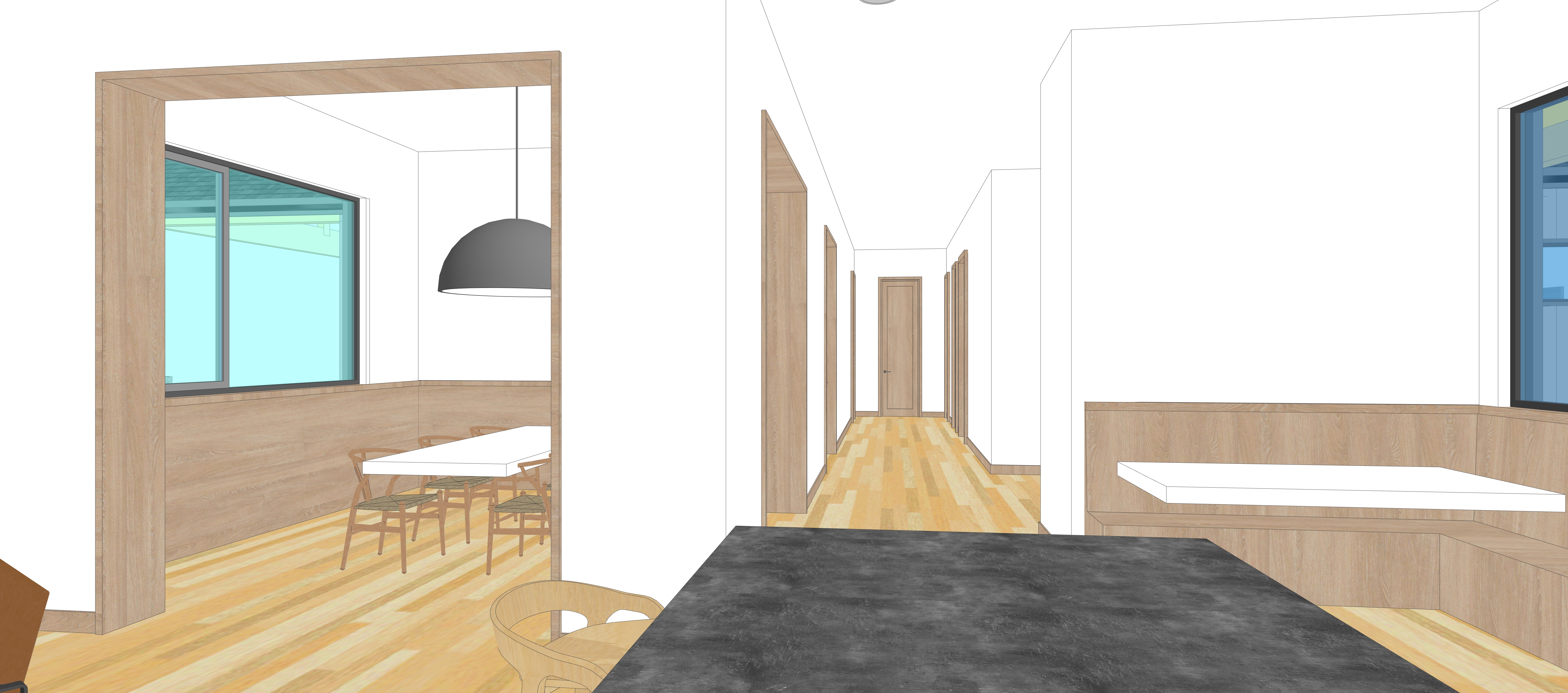 this is an interior view of the kitchen and living room in a modern farm house light filled room with oak floors and modern oak kitchen cabinets