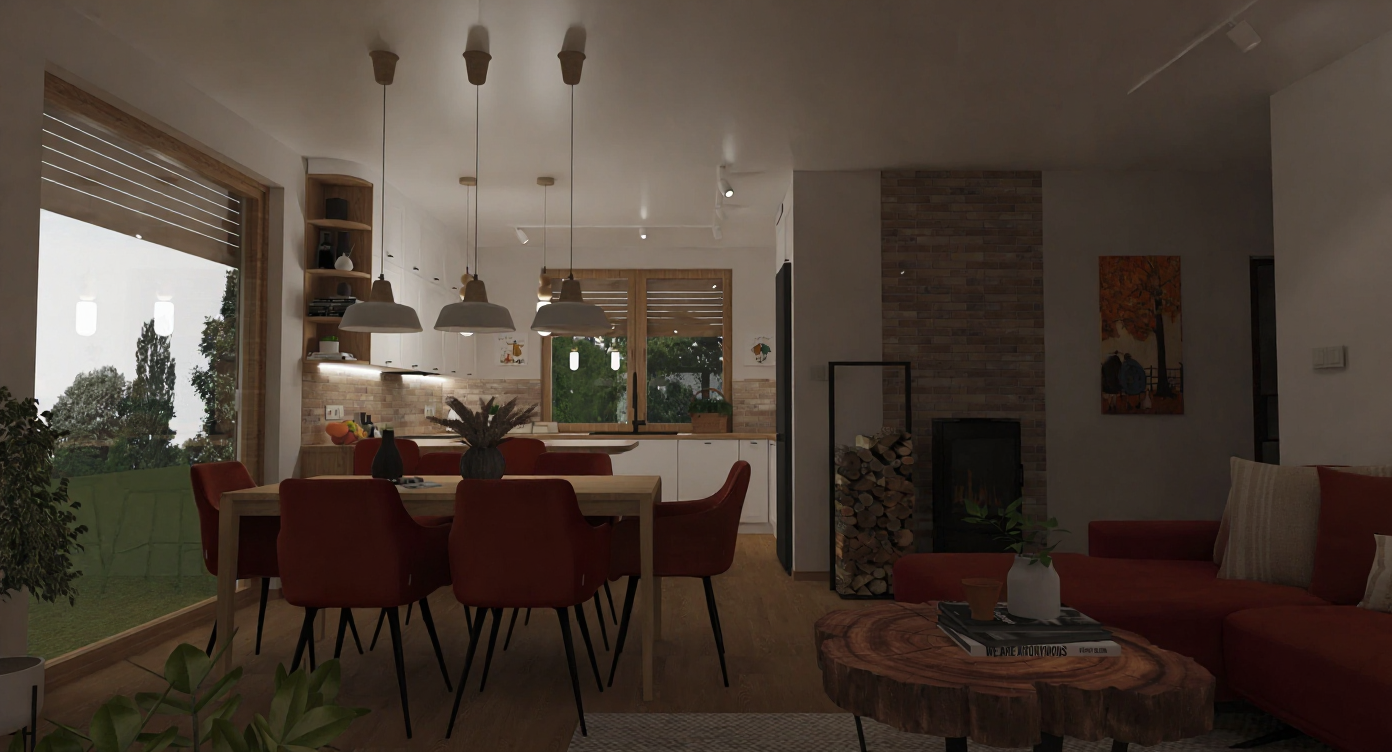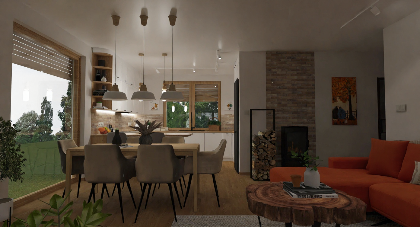 transform this picture into a realistic interior visualization with natural light keep the camera angle keep the original materials and textures and colours make it an ultradetailed view with global illumination and photo based rendering materials add sunlight and contrast