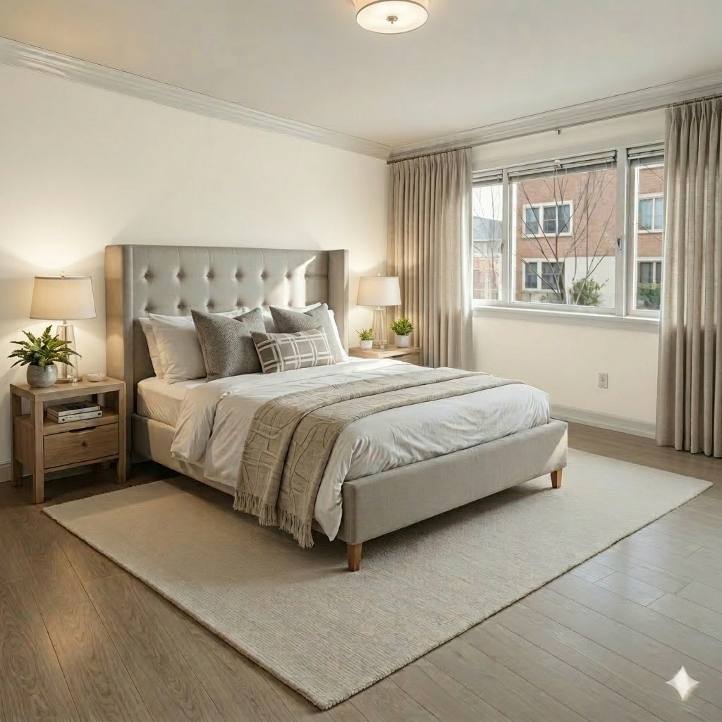 make the curtains an off white color change the throw blanket at the end of the bed to be a light tan knit throw do not change anything else in this space