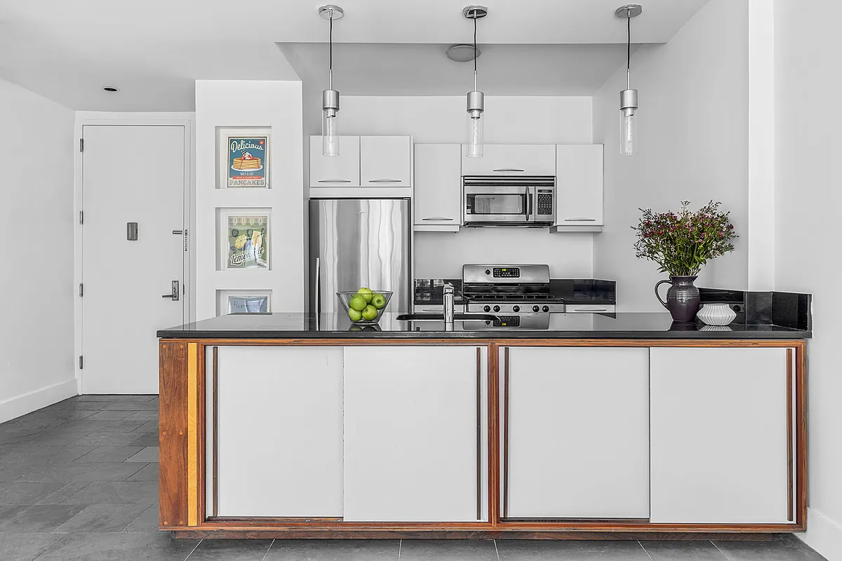 keep all the layout and appliances the same just raise the cabinets to the ceiling with a shaker style or other type of cabinet door merit lift off hinges in nickel and new light fixtures from italian manufacturer muselli oggettistica use the light fixture called 4321 https www musellioggettistica com en products elongated brass glass pendant 4321 to replace the three existing pendants then do a tile backsplash and change the countertop on the range side to some kind of stone with more veining in steven gambrels style and change the refrigerator to a french door refrigerator then do some cool painted wall on the right side and maybe a painted cabinet and maybe a painted ceiling only in the kitchen ceiling where the height changes thanks