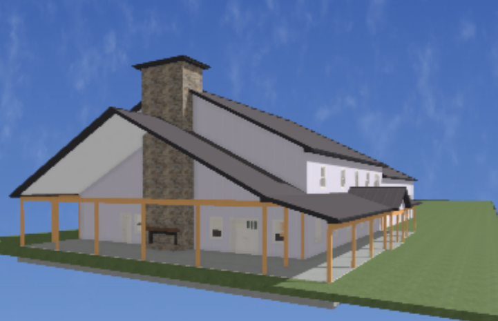 a high resolution ultra photo realistic rendering of a large farmhouse style building with white vertical siding dark standing seam metal roofing and a tall stone chimney centered along the side the structure features multiple rooflines wooden posts supporting the wraparound porch and detailed entry doors with glass panels all architectural features and proportions are retained exactly as shown surround the house with a lush dense forest setting with tall green trees in the background bright sunshine filters through the branches casting soft natural shadows across the siding stone chimney and porch floor emphasize realistic textures of stone metal wood glass and concrete with sharp detail and lifelike lighting for a fully immersive scene