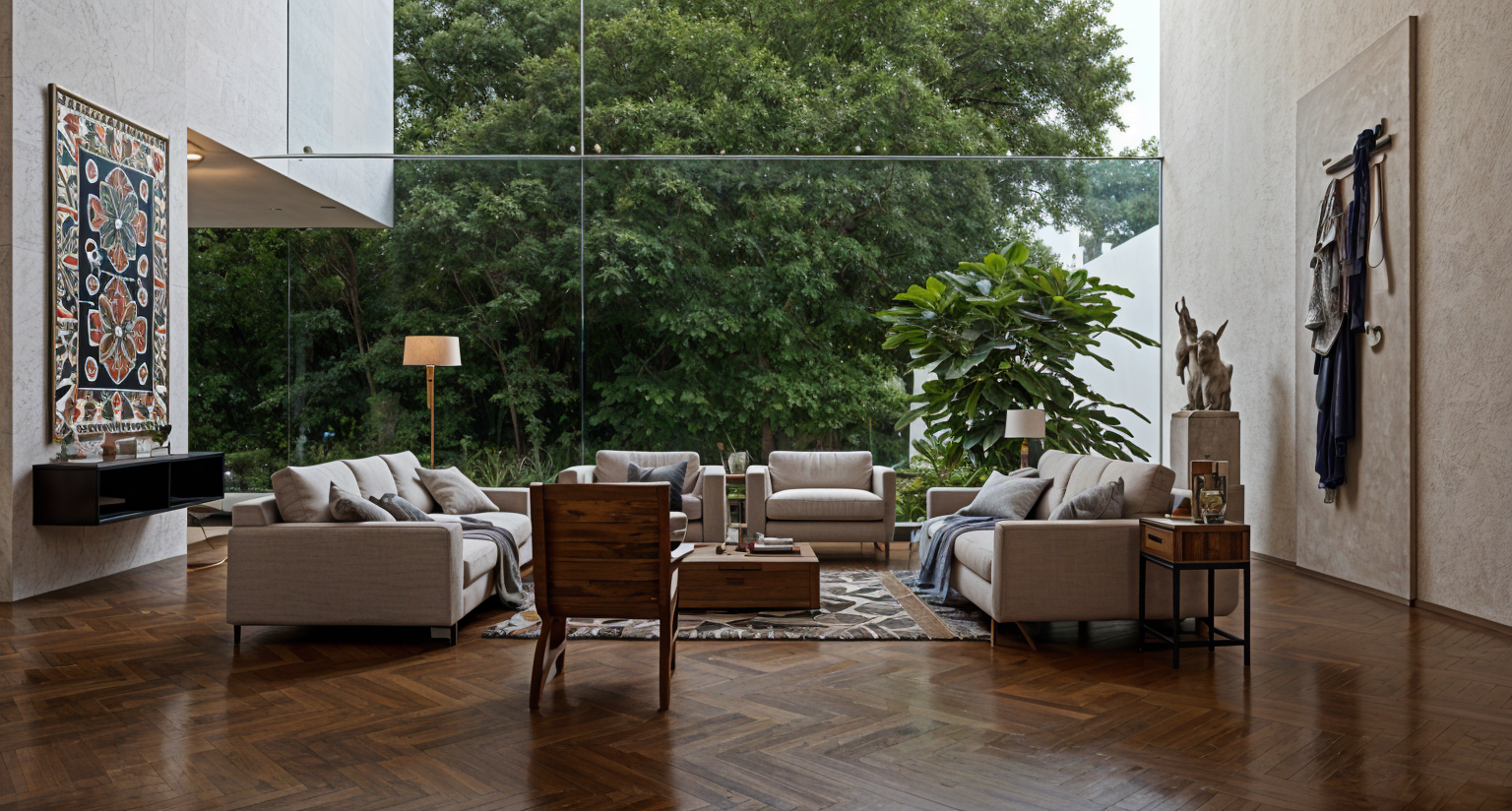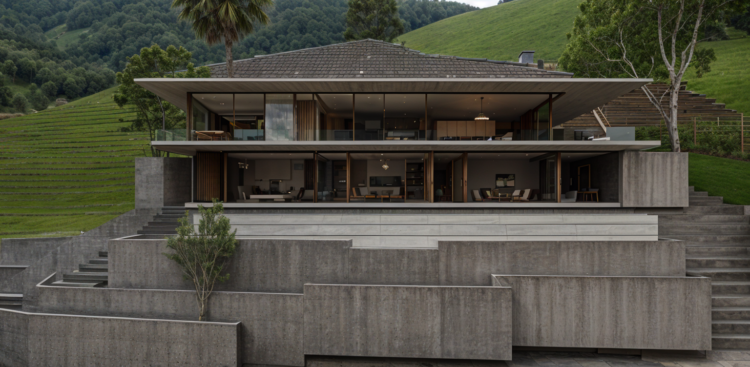 create a photorealistic render of this spacious bathroom with an overlooking hill view to the left side is a mirror