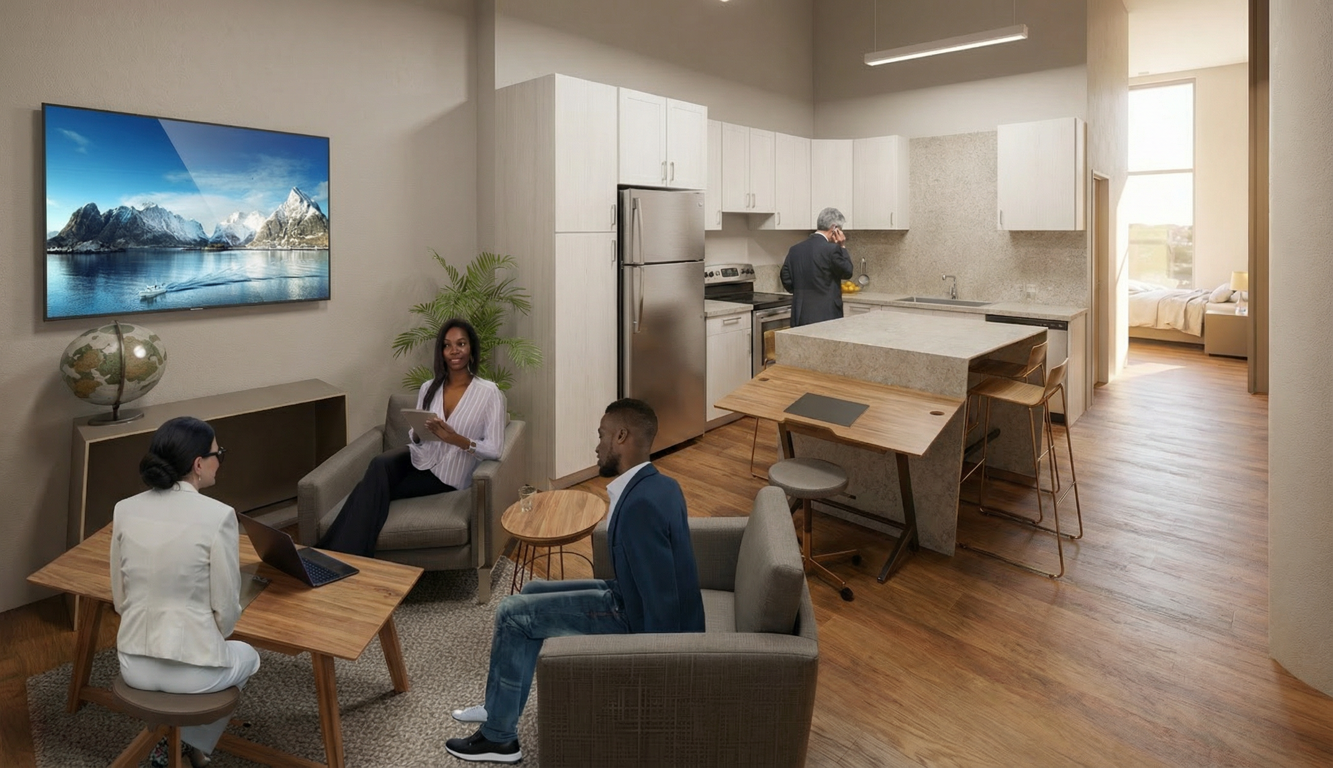 the desk is made of stainless steel the ceiling is made of suspended tiles painted dark gray the floor is matte concrete the carpet is dark gray with a thin black rubber border there is an opening in the wall for passing packages and the only window is on the wall to the left of the desk there is no window on the back wall behind the opening install recessed lighting in the ceiling