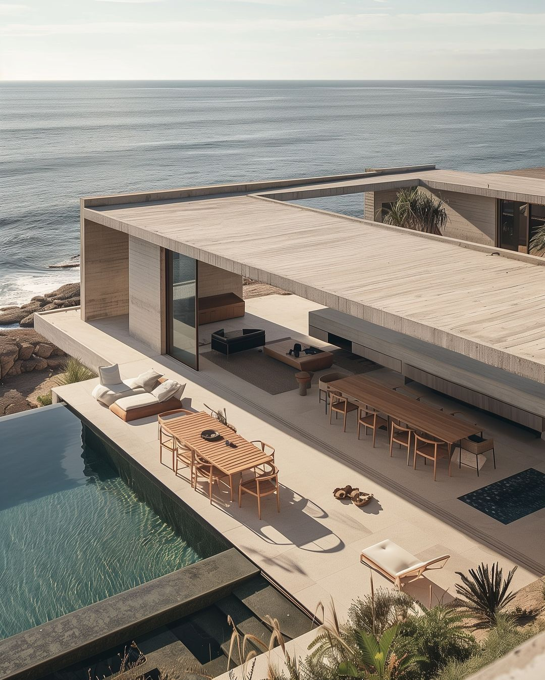 render a luxurious modern coastal home with a minimalist design focus on expansive views of the serene blue ocean and clear sky use natural materials with textures like light wood and soft stone the outdoor area features a chic infinity pool with shimmering aqua water arrange elegant wooden furniture with warm beige cushions in a spacious terrace setting incorporate lush green plants in the foreground adding a touch of nature create a tranquil warm atmosphere that evokes relaxation and elegance