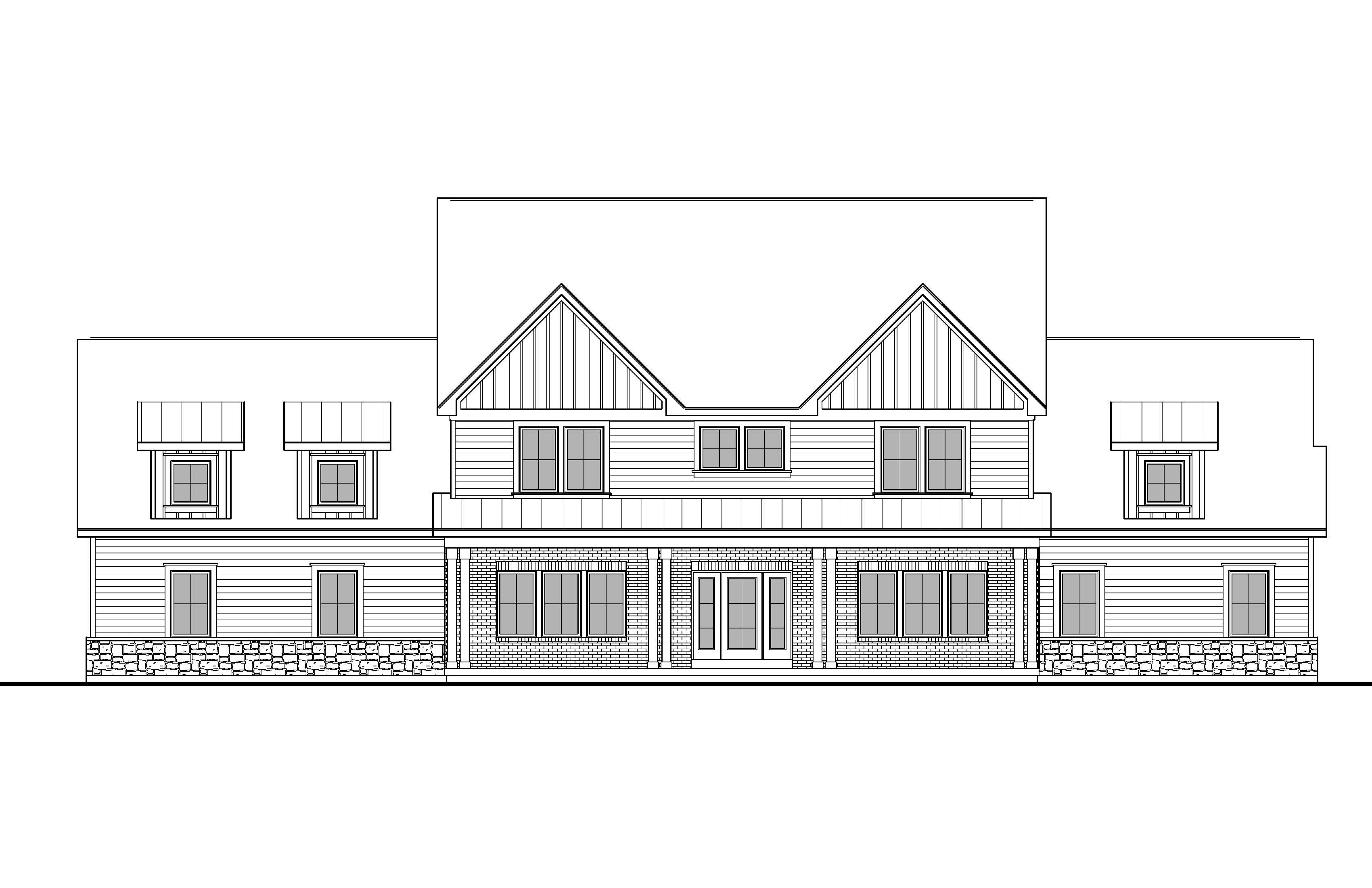 create photorealistic perspective of this home with a modern farmhouse feel with traditional red brick grey stone and white siding with black windows and black trim with black shingle roof provide lush vegetation in a suburban setting