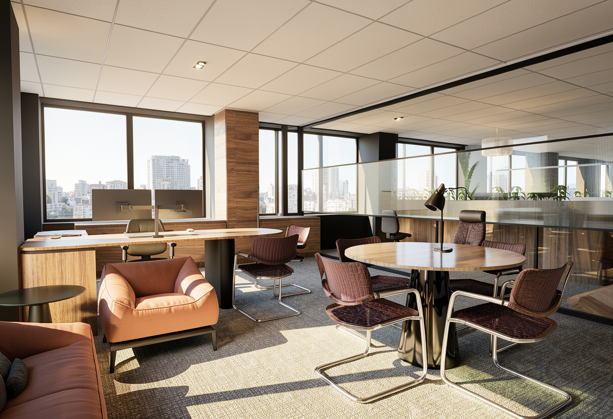 this is an an image render of a chairmans office do not adjust or make any adjustments to the existing scene leave all materials objects furniture equipment untouched unless specified in the prompt on the wooden round table make the black base matte finish and get rid of the tall office chair behind that table