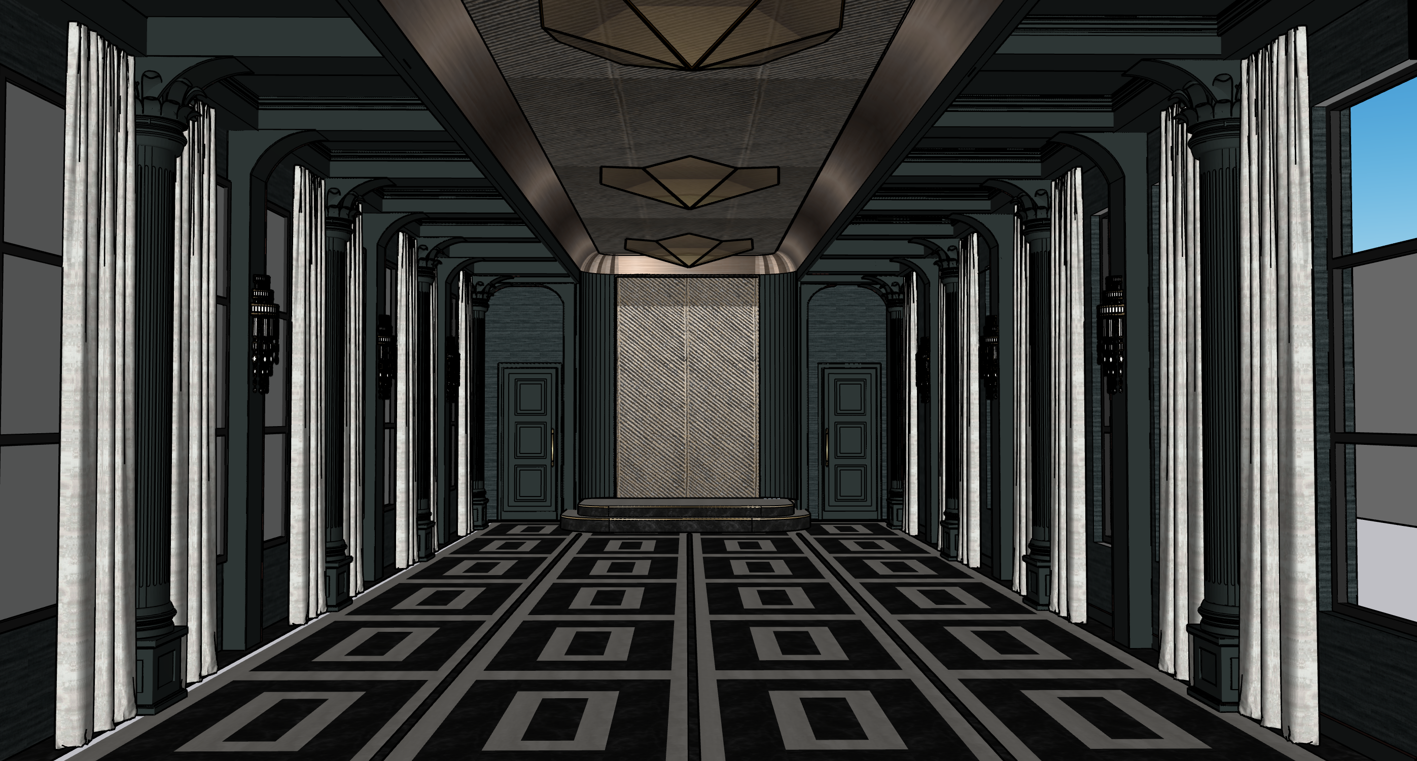 grand ballroom soft light around pewter ceiling cove up lighting from 3 chandeliers in center soft lighting on sconces back wall brass metal texture slightly glossy marble flooring keep items looking as is walls are a teal wallpaper chandeliers in center are not translucent solid with an up glow keep textures the same window is on a 2nd story city area windows are on right and left side walls keep floors the black and white marble showcase the back doors more lighten room slightly no light on back doors up light the back wall brass texture up light the teal columns enhance lighting keep curtain color off white silk keep brass to the center of the back wall keep textures as is
