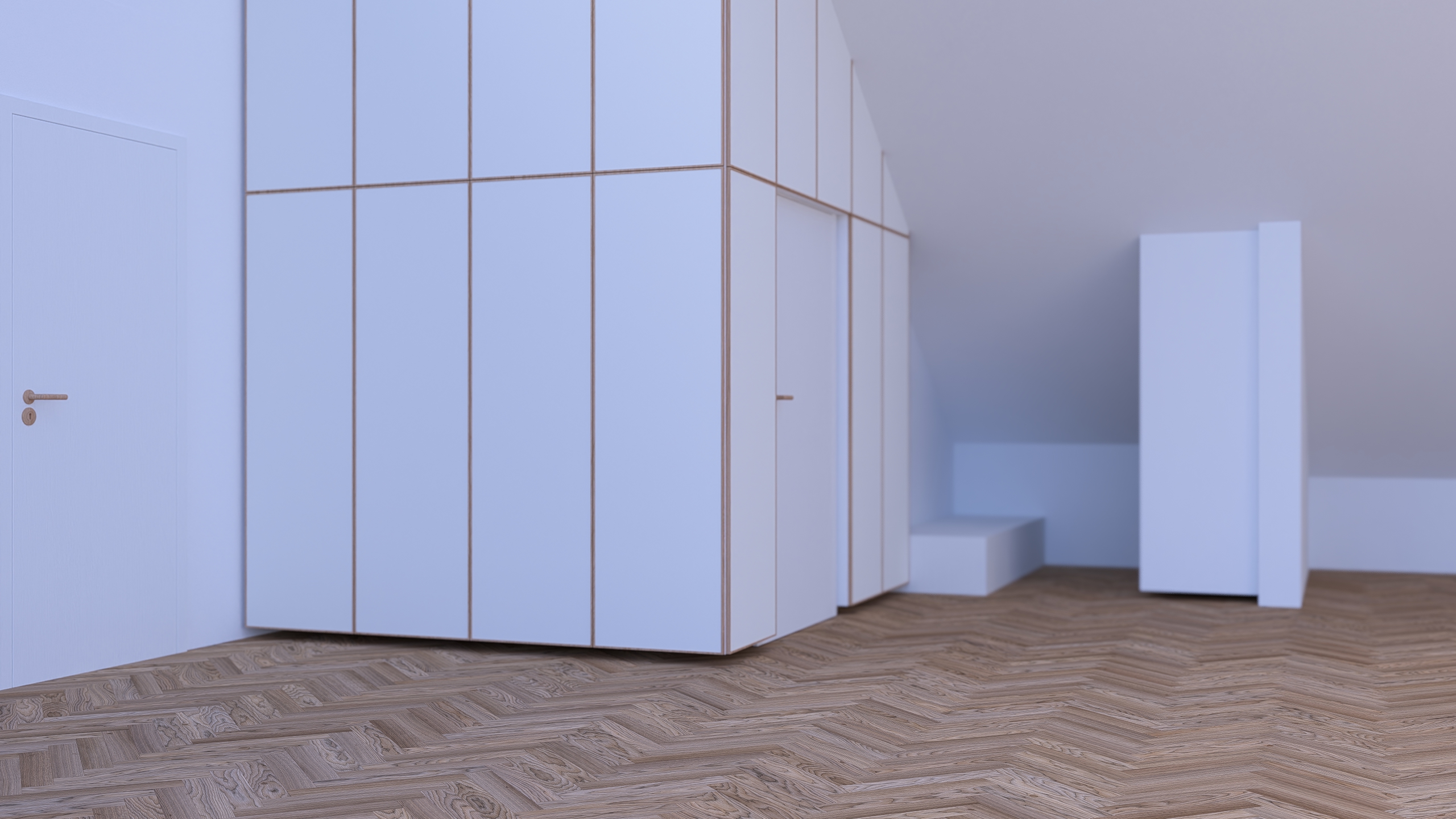 photorealistic interior rendering of a modern residential hallway clean and elegant design the wardrobe and coat storage clearly positioned on the right side of the image next to the window built in wardrobe with warm white finishes panels integrated coat hooks and hanging space closed storage cabinets below soft indirect led lighting integrated into the wardrobe cosy bench and shoe storage near the wardrobe calm neutral color palette with warm beige soft gray realistic materials and textures natural daylight entering from the background soft shadows global illumination architectural visualization wide angle lens eye level camera ultra high detail 8k cinematic yet natural lighting photorealistic