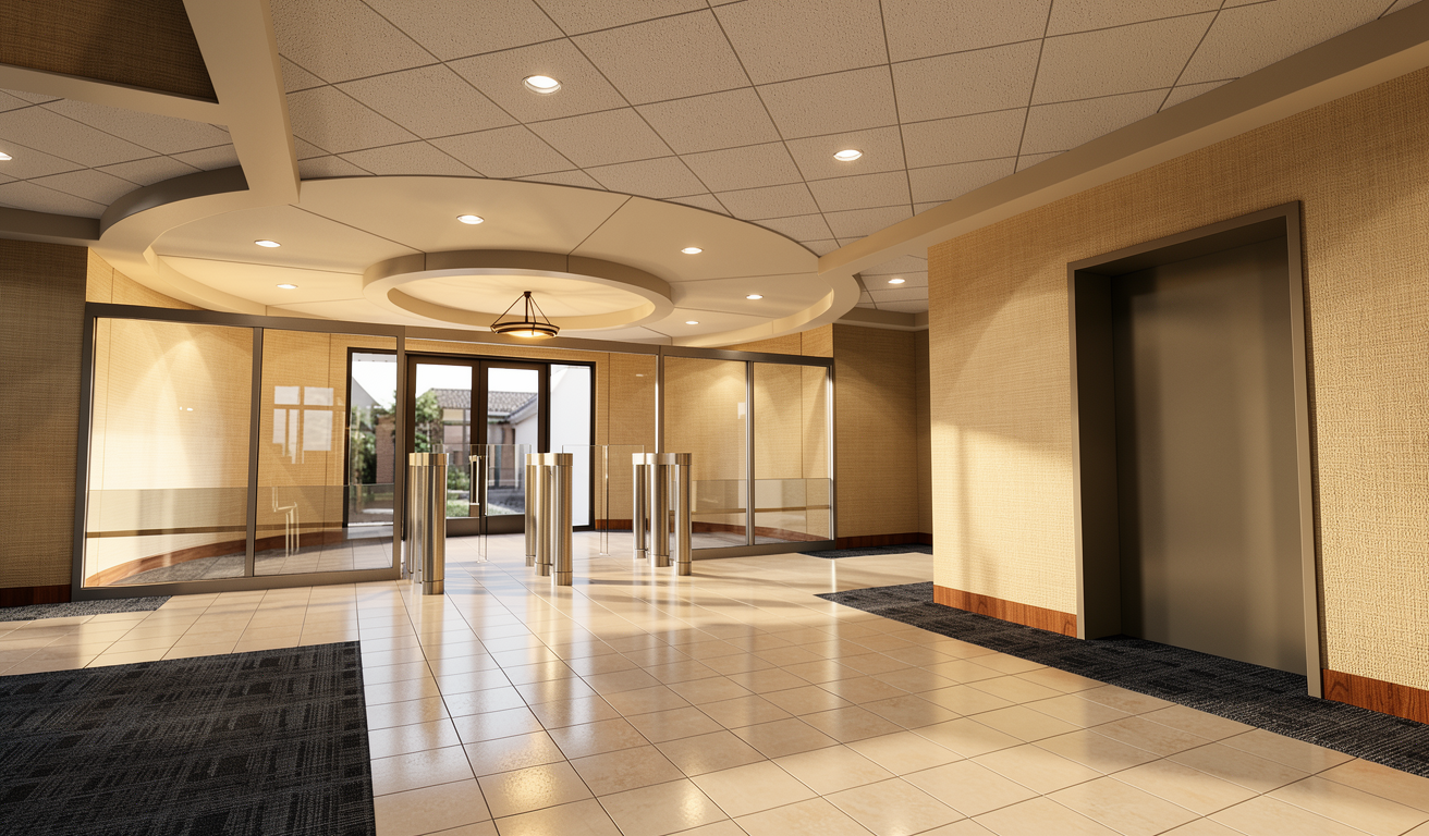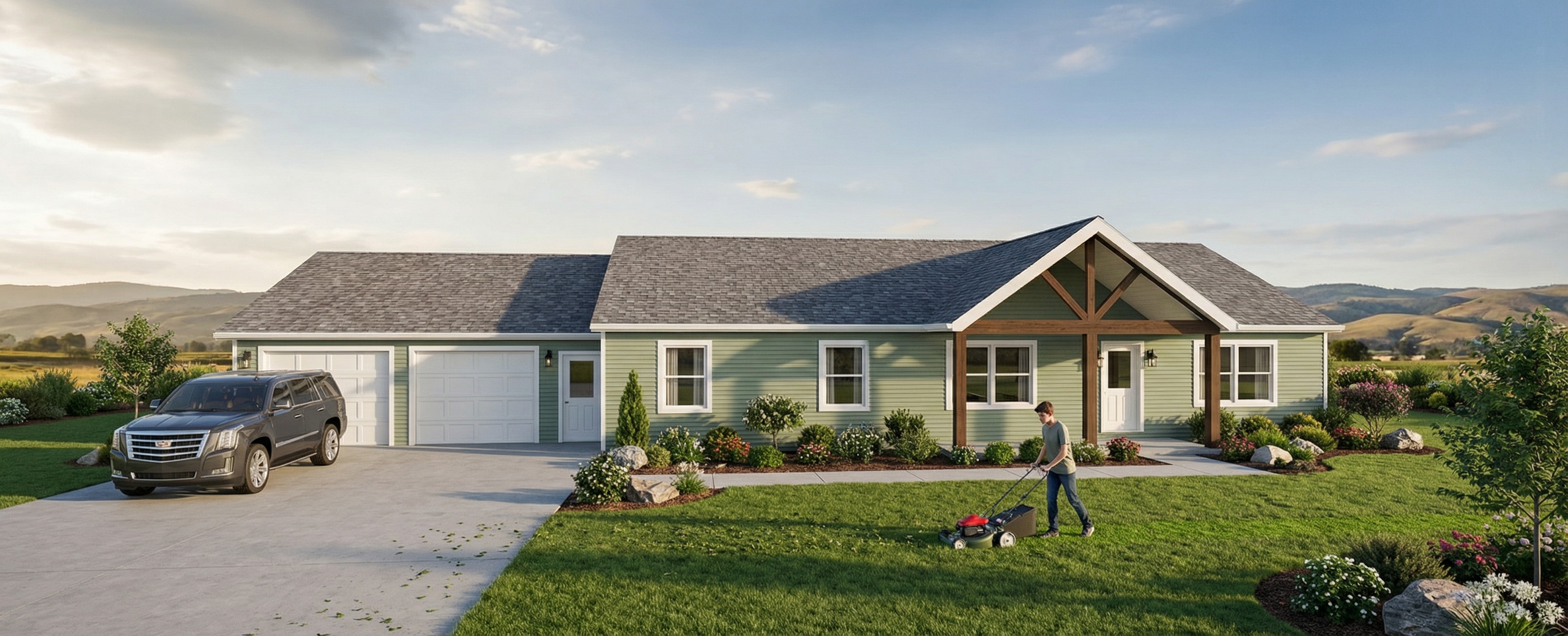 make photorealistic exterior scene with attractive yard and landscaping add a cadillac escalade in the driveway show teenager mowing the front yard change siding color to a grayish blue color