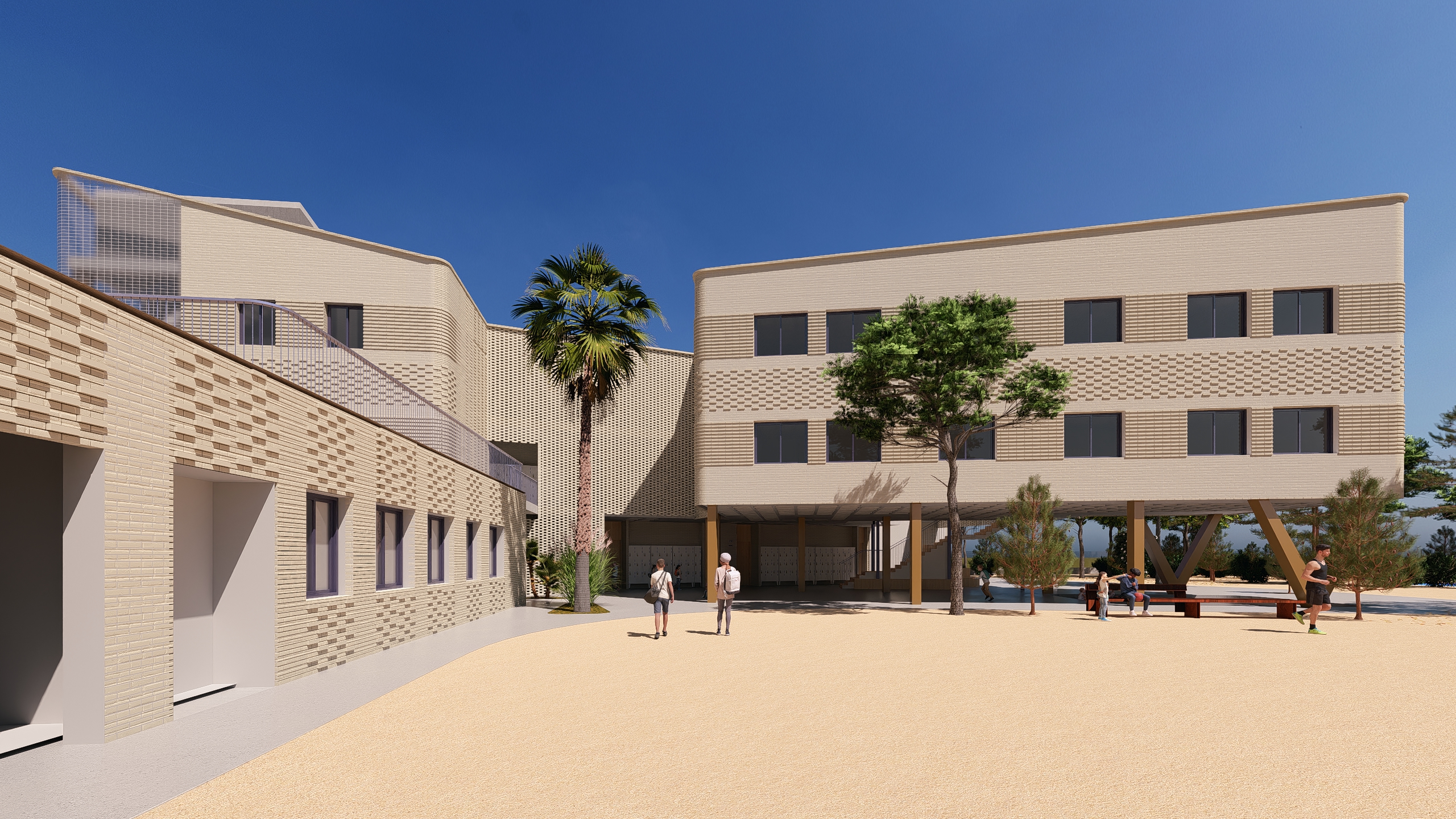 exterior shot contemporary brick fa ade with abstract linear composition strictly non figurative design a contemporary architectural fa ade using exposed brick as the primary material developed as a large scale abstraction of a graphic composition the intention is not to replicate any specific shapes from the reference but to translate its underlying visual logic into a fully buildable architectural system the fa ade should be composed exclusively using two brick tones a warm cream color as the dominant background and a deep matte blue used as an accent no additional colors should be introduced the material must remain realistic with a matte finish visible mortar joints and standard brick proportions the composition must be strictly non figurative do not include circles icons symbols drops or any recognizable shapes instead the design should be entirely based on linear organization spatial rhythm and controlled variation the fa ade should be structured on a modular grid which serves as a base for organizing the composition within this grid introduce a system of lines that vary in thickness density and continuity these lines can run horizontally or vertically sometimes extending across long s of the fa ade and sometimes breaking shifting or offsetting to create variation curves may be introduced but only as a natural extension or bending of linear paths these curves must never form closed geometries or recognizable figures they should remain open directional and abstract the composition should balance areas of high density where multiple lines interact overlap or run in parallel with areas of calm where the cream background dominates and the pattern relaxes this contrast is essential to achieve a dynamic yet controlled visual field blue brick should be used exclusively to define these linear systems it must function as a graphic layer embedded within the fa ade guiding the eye through the composition at no point should the blue elements form closed shapes or decorative motifs they must remain part of a continuous linear logic subtle depth should be introduced through small variations in relief certain linear bands may be slightly recessed or slightly protruding within a realistic construction tolerance enhancing shadow and texture without compromising buildability the overall fa ade should read as a continuous surface where the pattern is integrated into the material system itself not applied superficially the design must be fully constructible using standard brick techniques natural side lighting should be considered allowing shadows to emphasize the relief joints and linear articulation of the surface the final result should feel like an architectural translation of a graphic language precise abstract and restrained where the emphasis is on rhythm continuity and spatial organization rather than representation more abstract only lines and facade made of bricks texture