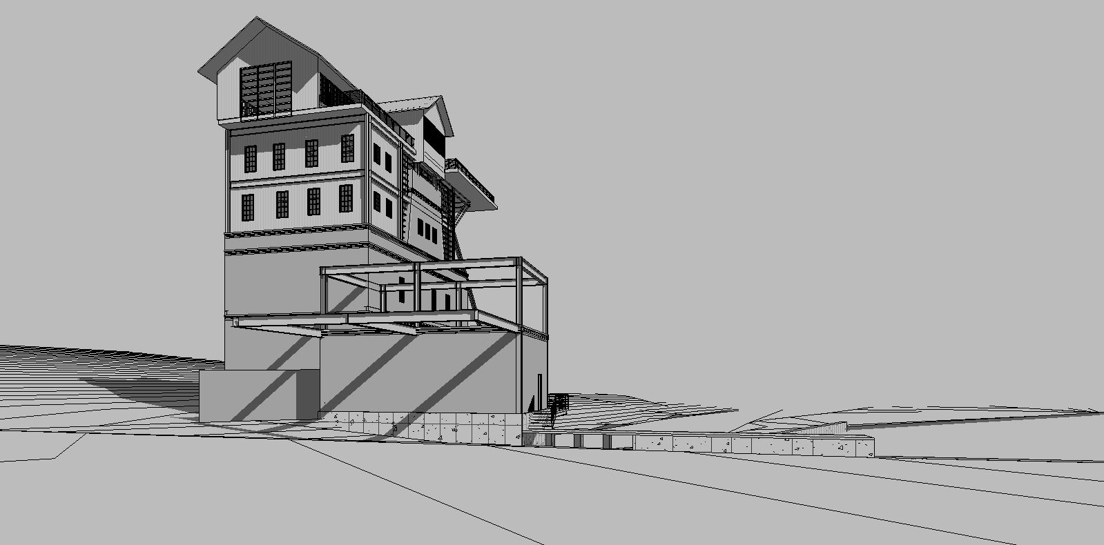 dark vertical wood shiplap siding on condo units with large glass windows brick existing building concrete panel foundation river with dam foreground trees in background dusk sun on building face fog soft interior lighting