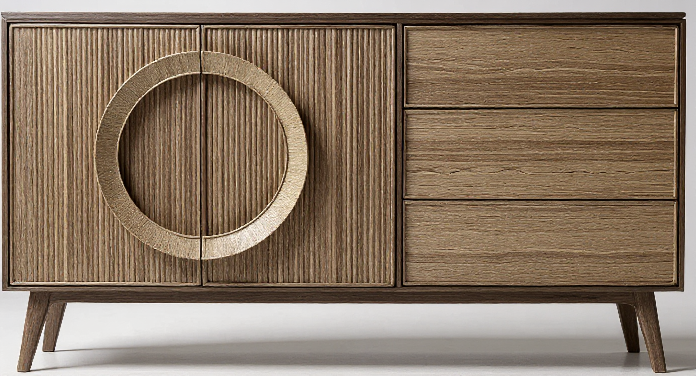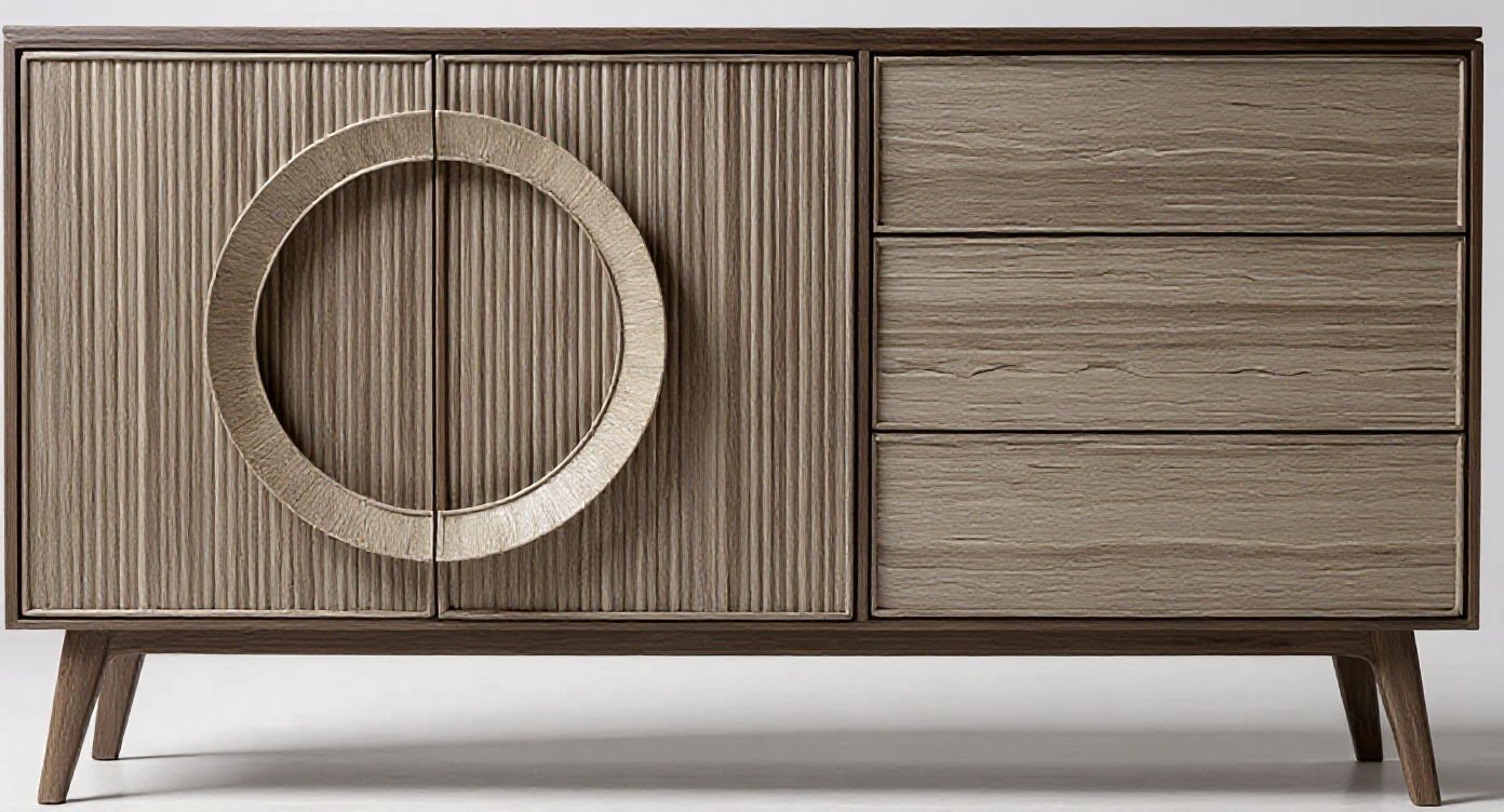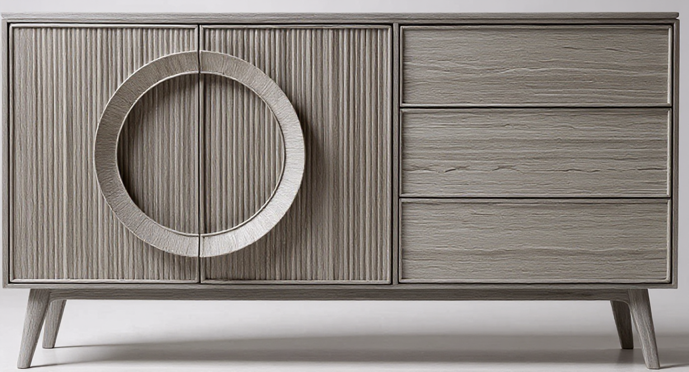 light grayish oak wire brush finish with rattan weaving cabinet doors white background