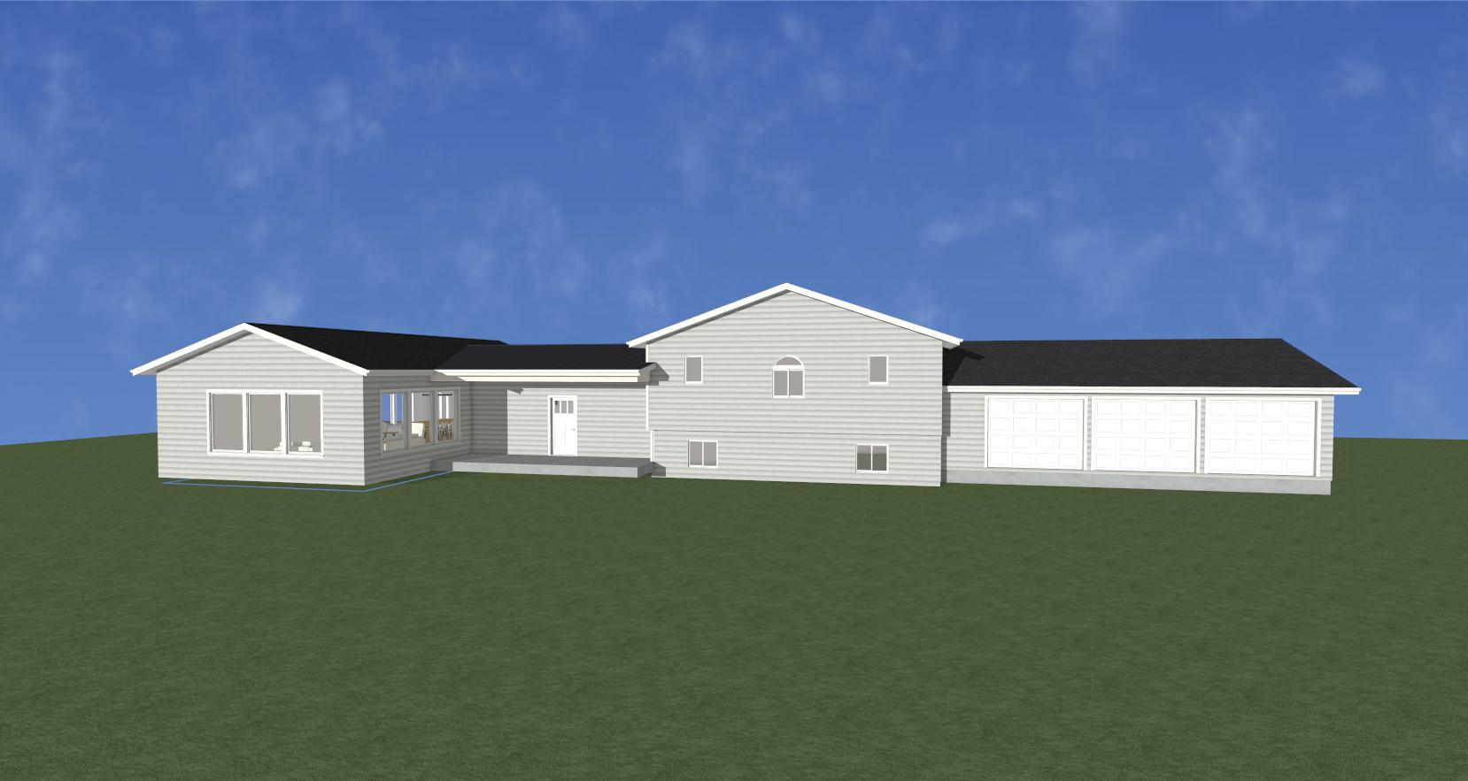 render a beautiful scene of a modern single story house with a light gray exterior and white trim the roof is black with clean straight lines the house sits on a vast lush green lawn under a clear vibrant blue sky with a few soft white clouds to create a peaceful atmosphere add sunlight casting gentle shadows to enhance depth and detail evoking a warm welcoming ambiance