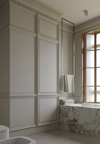 exterior shot create a luxe primary bathroom with sunlight brass fixtures and warm lighting use warm natural stone for the tub face and countertops