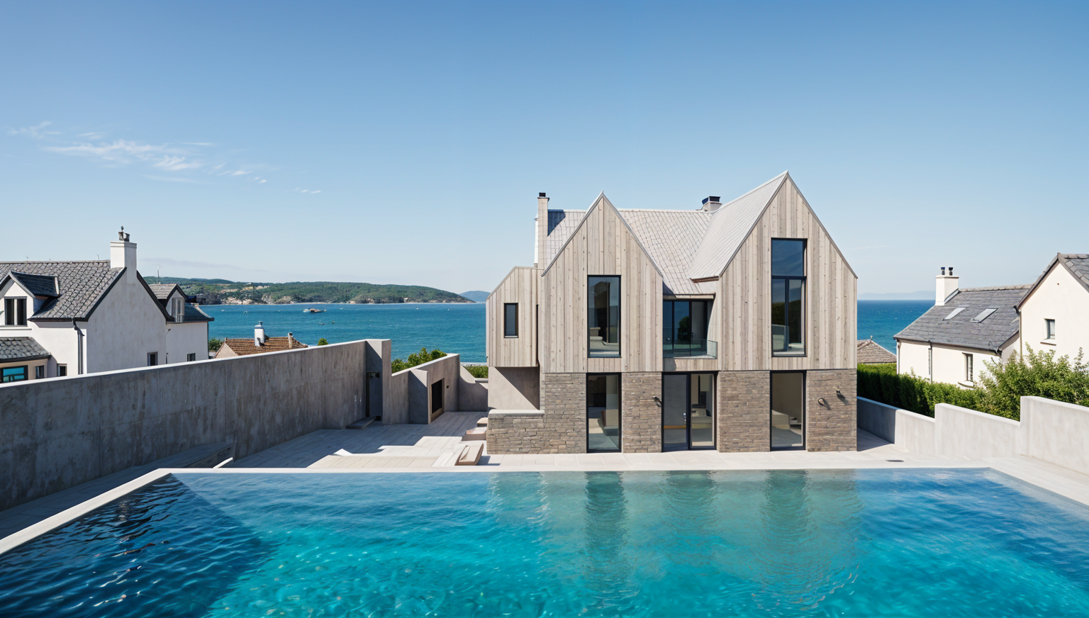 create a beautiful photo realistic rendering of this house the siding is a dark slate gray and the trim is bright white the window frames are white too provide mature trees in the background and manicured lawn with plantings in the foreground