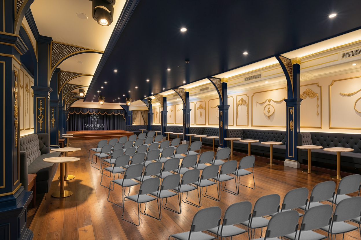 make the ambience dim lit with coloured club lighting highlighting the floor and seating
