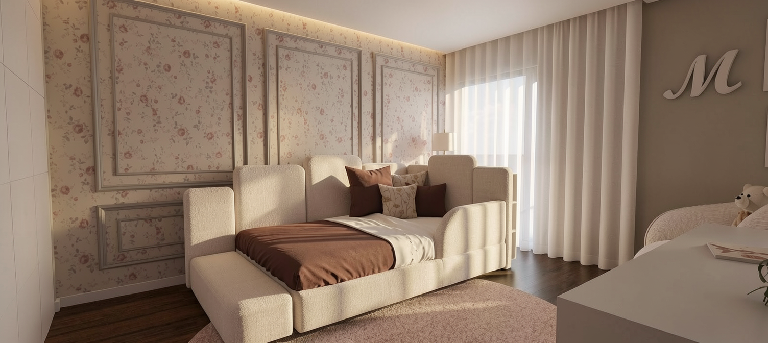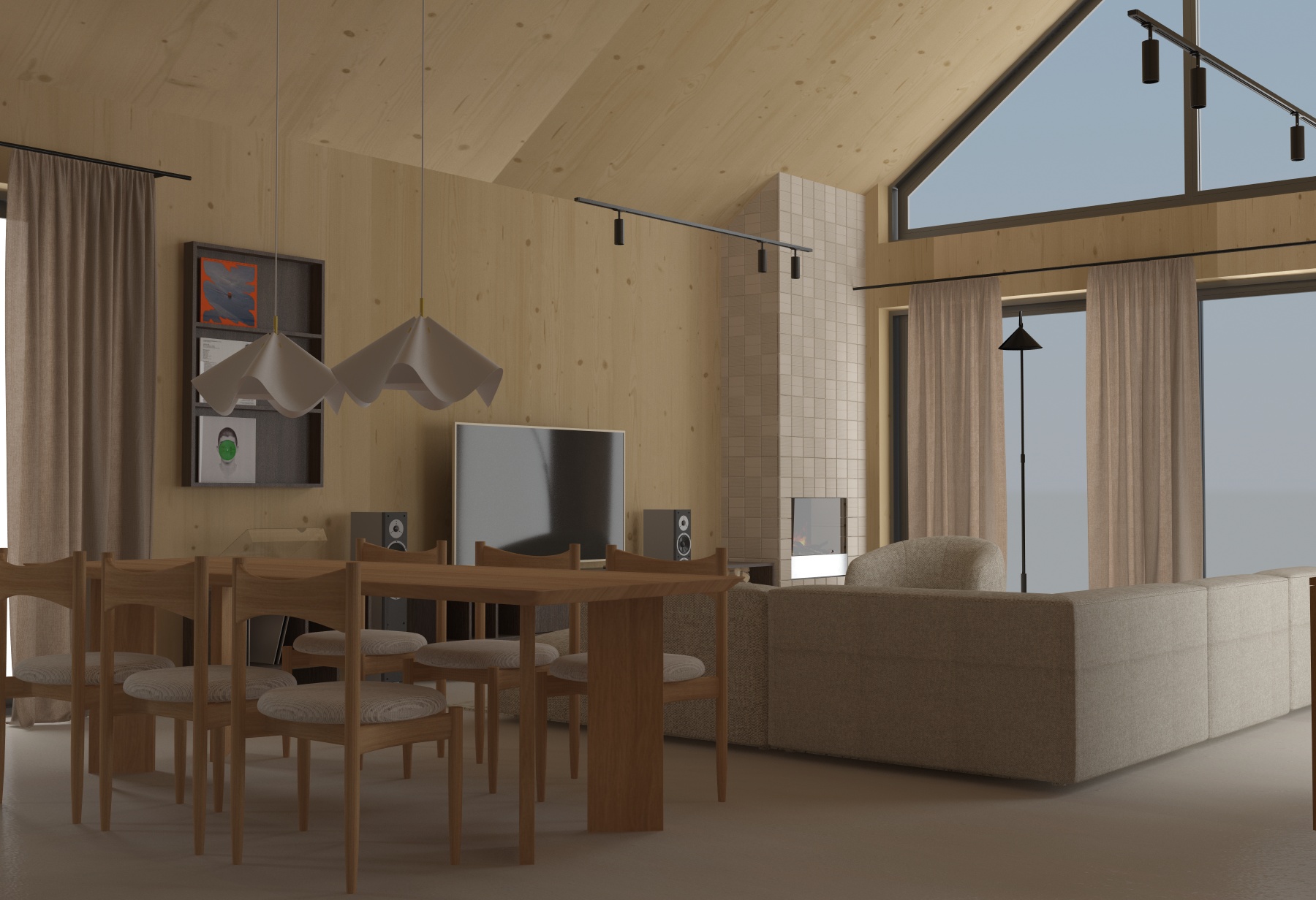 enhance the lighting by adding bright natural daylight streaming through the windows ensure the walls are rendered as flawless select grade clt cross laminated timber wood with virtually no knots or imperfections creating a perfectly clean and smooth wood grain surface while maintaining the original light wood color from the base image the sofa should be finished in a light beige fabric maintain high architectural precision and realistic shadows behind the window there is wooden terrace and garden