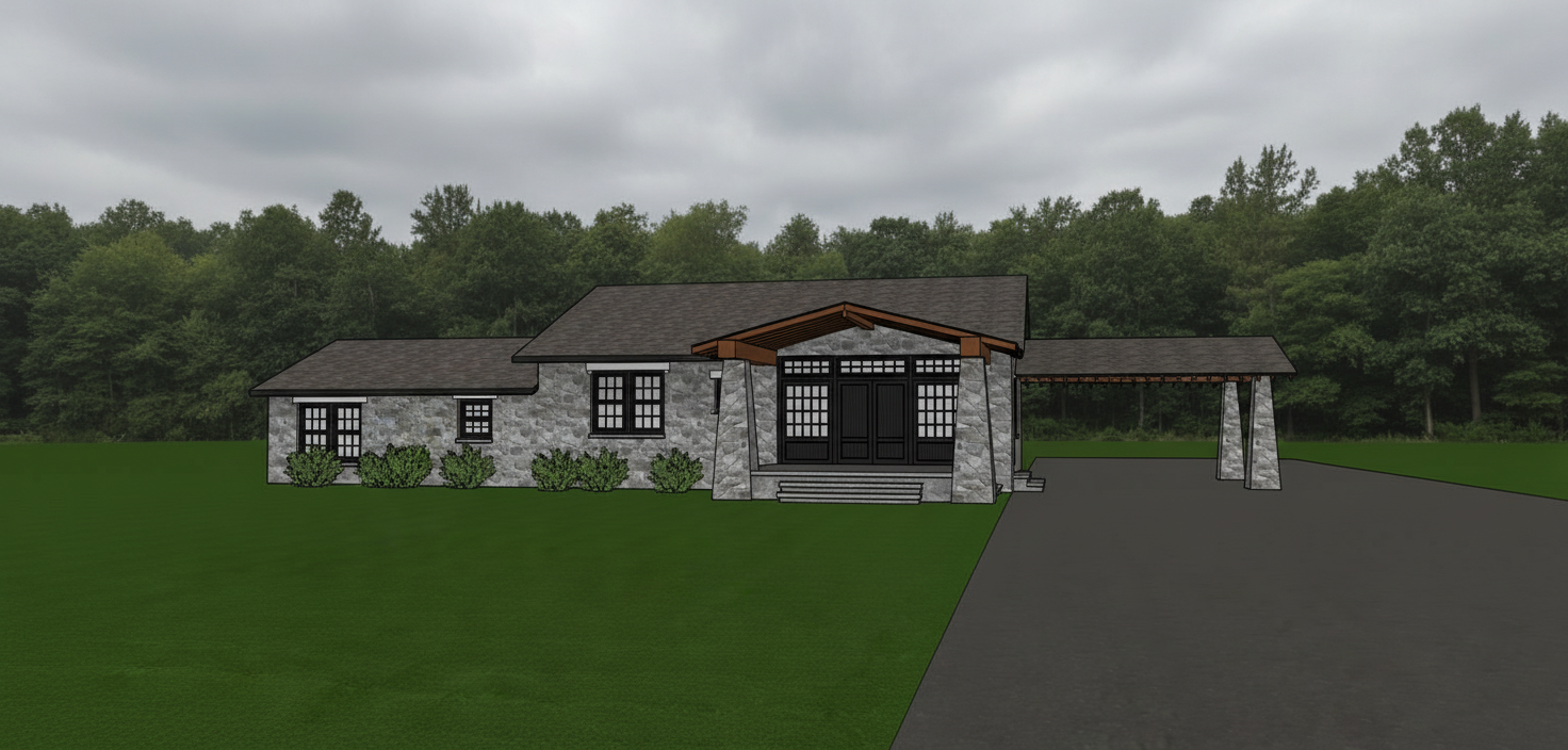 mix the exterior materials with wheat colour brick on the outer ends and limestone above the doors and remove the cars and add windows to the basement level with nice paver with grass perforations