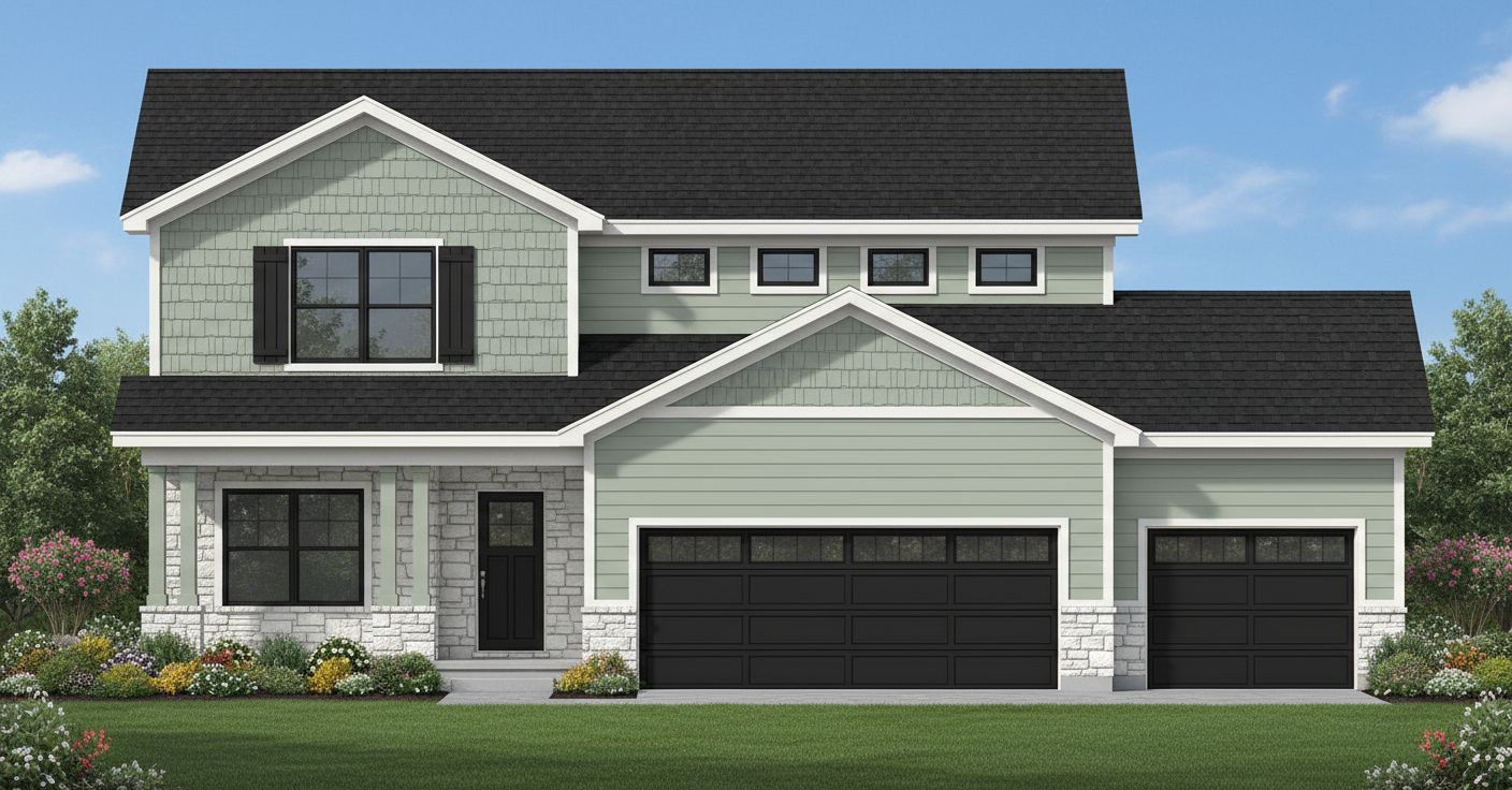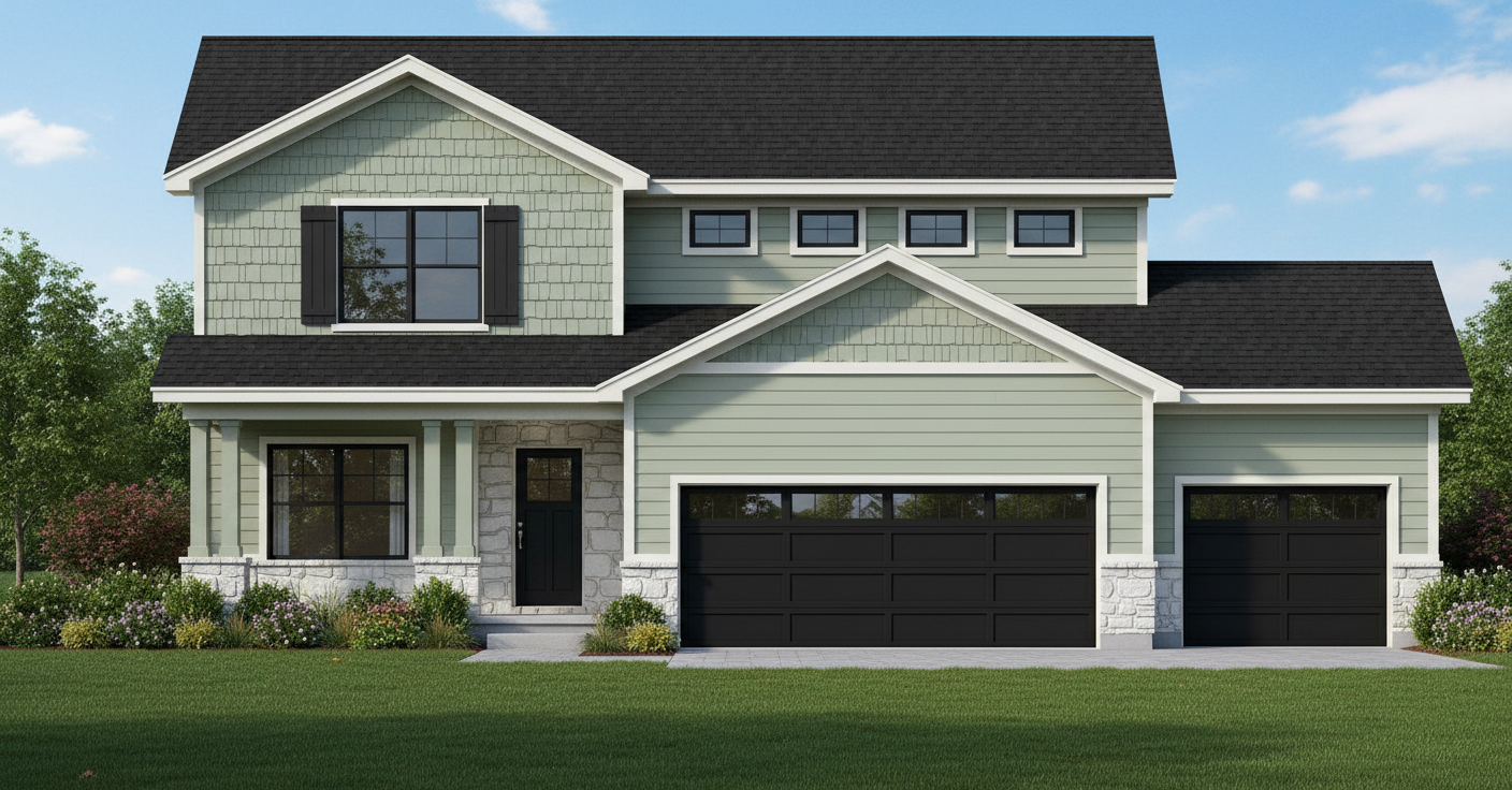 green siding green shakes white stone black windows black roof black front door green porch pillars