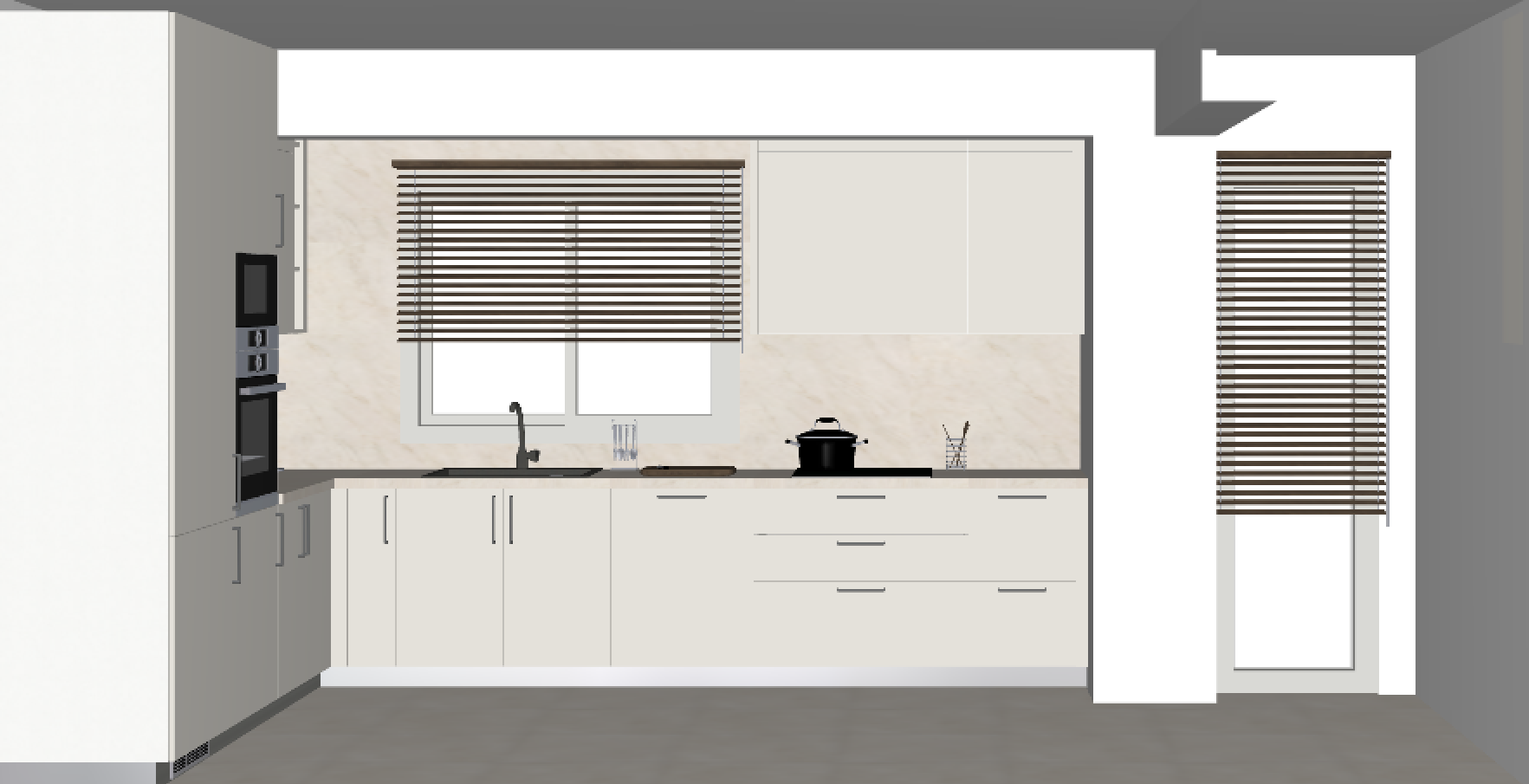 render a modern kitchen with a sleek minimalist design featuring light cream cabinets and a subtle beige marble countertop integrate a polished chrome coffee machine on the counter place a minimalist vase with delicate dried branches on the table which has a light wooden surface paired with chairs in muted gray tones enhance the ambient space with soft natural light filtering through wooden blinds on the right incorporate a fresh invigorating atmosphere with a bowl of vibrant green apples on the counter creating a contrast against the neutral hues add reflections and shadows to create depth and realism