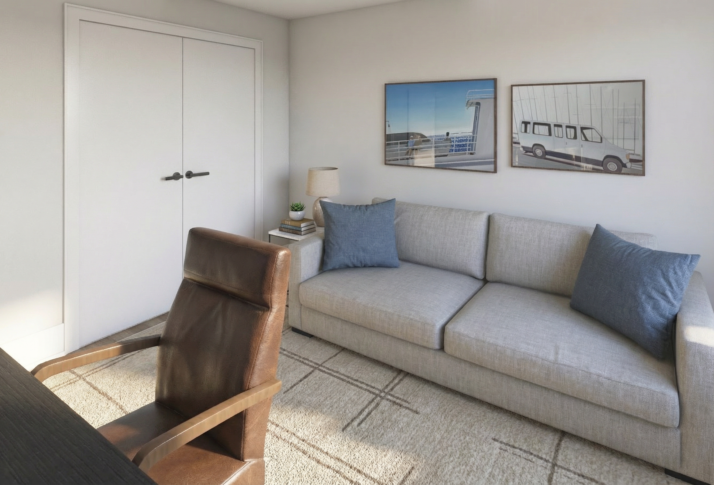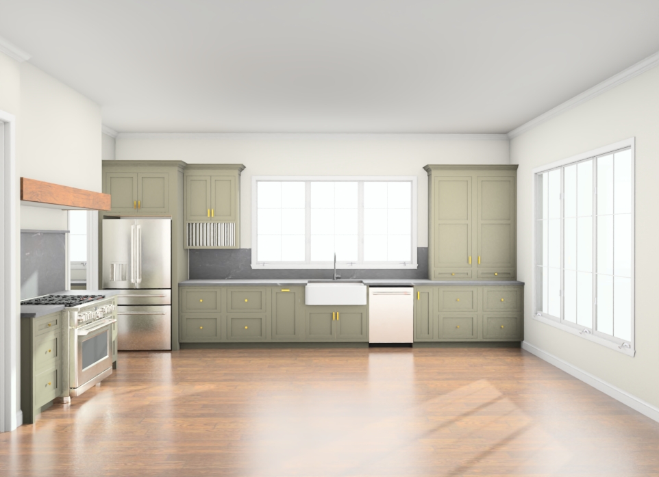 create a hyper realistic image from this kitchen renderings cabinets are a muted fern green countertops and backsplash are soapstone wooded view through the windows with sunlight streaming in do no alter the cabinet layout or details