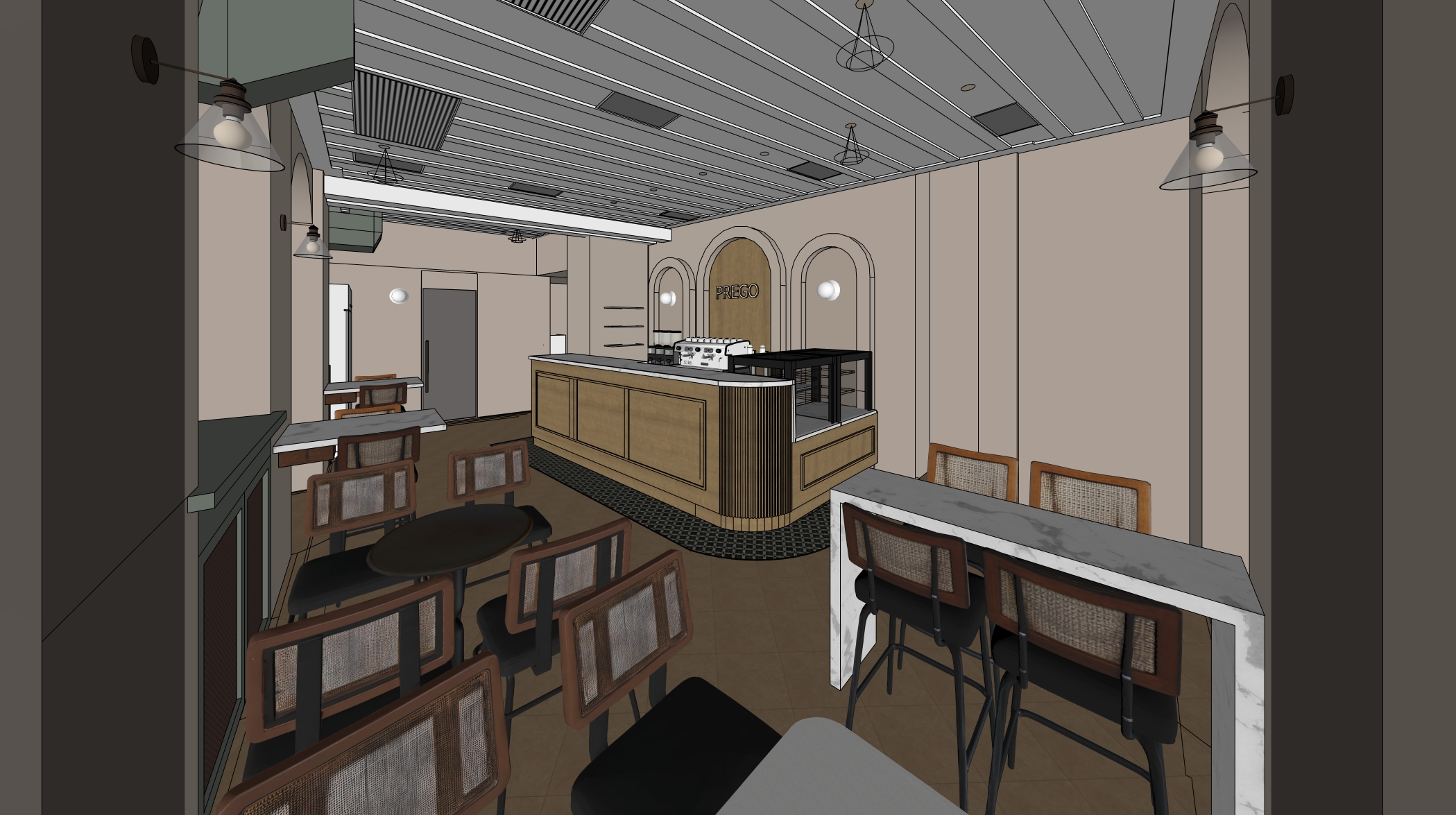 transform the provided coffee bar interior image into a high end photorealistic render of a refined minimal italian caf with a warm and elegant morning coffee atmosphere the architecture and geometry must remain exactly as in the original image do not change move resize or alter any walls ceilings bar shapes furniture positions shelving structures booths curtains windows or spatial layout all elements must stay in their exact positions proportions and alignment the transformation should focus only on materiality lighting atmosphere and styling while preserving the entire original design design direction apply a minimal italian caf aesthetic with elegant timeless materials and calm mediterranean tones use a refined palette such as warm sand beige soft cappuccino tones walnut wood brushed bronze or brass accents natural stone or marble matte leather upholstery warm neutral ceramics materials choose materials that reflect contemporary italian caf interiors light plaster or microcement walls in soft sand beige tones refined natural wood finishes such as walnut or light oak subtle polished stone or marble surfaces ceramic flooring with natural earthy tones such as terracotta style porcelain like purse terra by stn ceramica with minimal grout joints 1 mm matte leather seating and elegant metal frames all materials must appear realistic premium and tactile with visible textures natural imperfections and subtle reflections lighting create a bright but warm morning caf atmosphere natural daylight entering the space warm italian style bronze lighting fixtures soft shadows and gentle highlights balanced brightness suitable for a relaxed breakfast coffee setting lighting should enhance material richness and spatial depth styling add tasteful lifestyle elements while keeping all furniture positions unchanged espresso cups and cappuccino glasses small breakfast plates or pastries subtle caf table styling include a few modern guests casually socializing and two bartenders behind the bar preparing coffee naturally integrated and correctly scaled without overcrowding the space bar display keep the bar structure exactly the same but style it with minimal italian caf materials the display counter should appear filled with pastries and cakes with realistic glass reflections and texture bar shelves should feature wine bottles and premium spirits softly illuminated with warm accent lighting final look the final image should feel like a luxury architectural photograph of a minimalist italian caf emphasizing elegant simplicity warm mediterranean tones premium materials calm and refined atmosphere while preserving the original geometry and layout exactly as designed