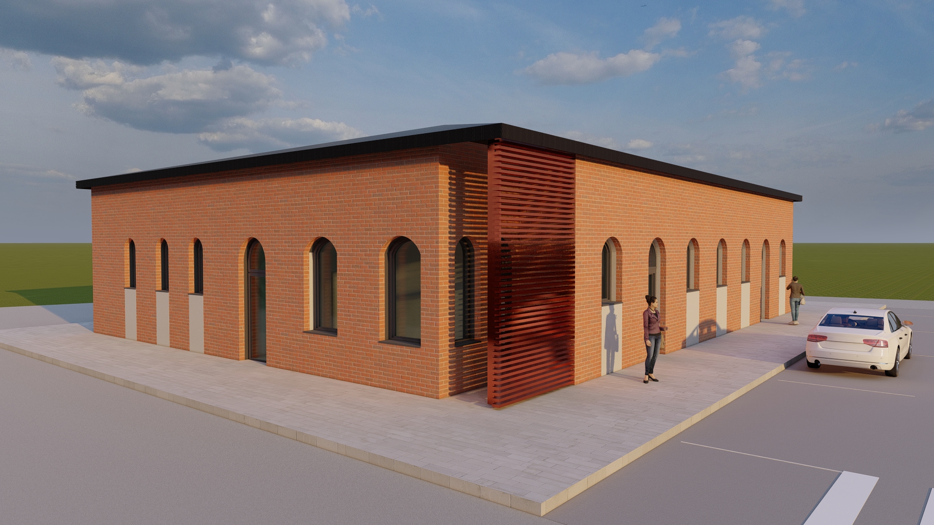 keep the building as it is adjust the materials to be more realistic without plants on the facades add background with a few small houses and green trees