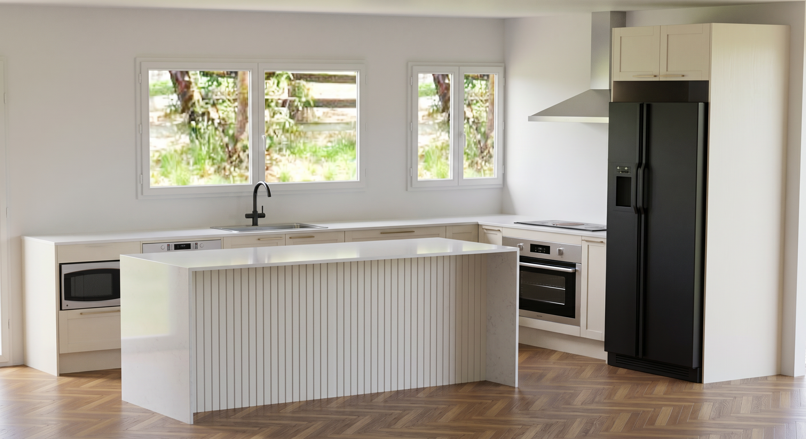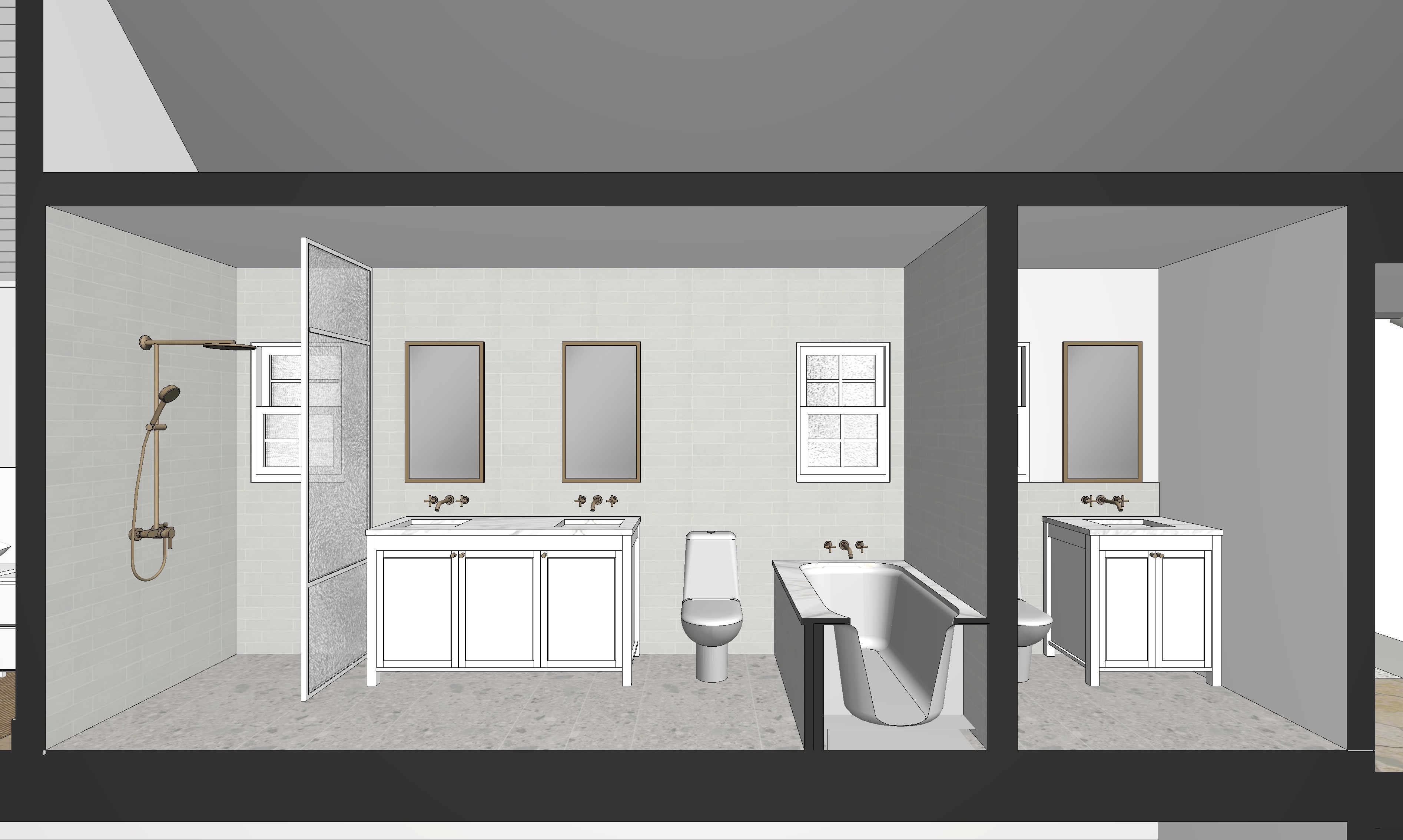 using the provided image as the exact base model create a fully photorealistic luxury bathroom interior do not alter move redesign or reinterpret any architectural geometry proportions materials layout or camera perspective preserve all wall alignments fixture placements exactly as shown lighting atmosphere render ambient atmosphere with soft indirect lighting materials finishes marble white marble with pronounced gray veining calacatta style highly detailed with realistic subsurface variation and a honed finish terrazzo to floor tile glazed subway wall tile with natural variation glass enclosure textured frosted glass metal accents dark brass