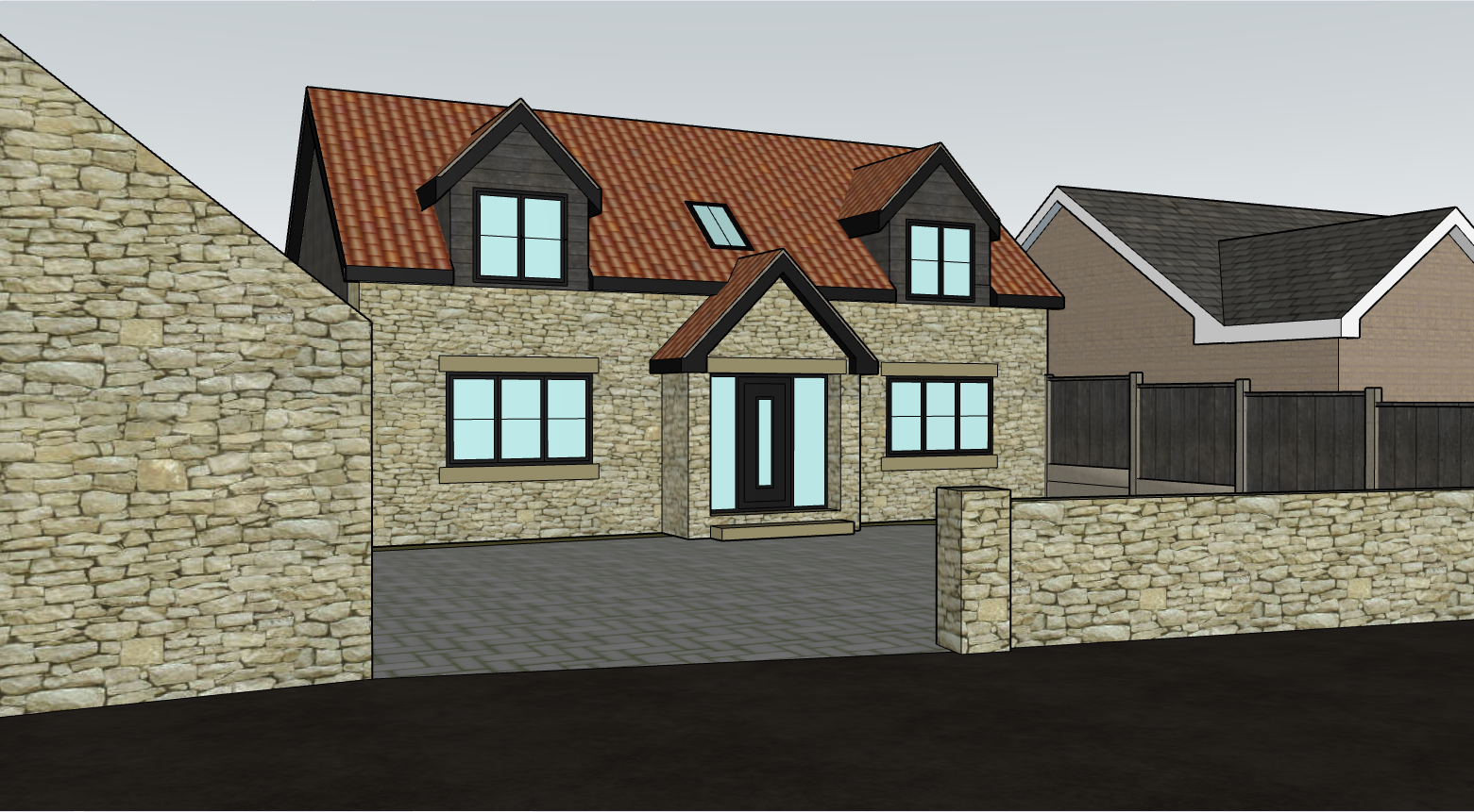 black doors and windows grey timbr cladding stone sills and headers to windows block paving to driveway ashphalt road natural lighting with soft shadowing