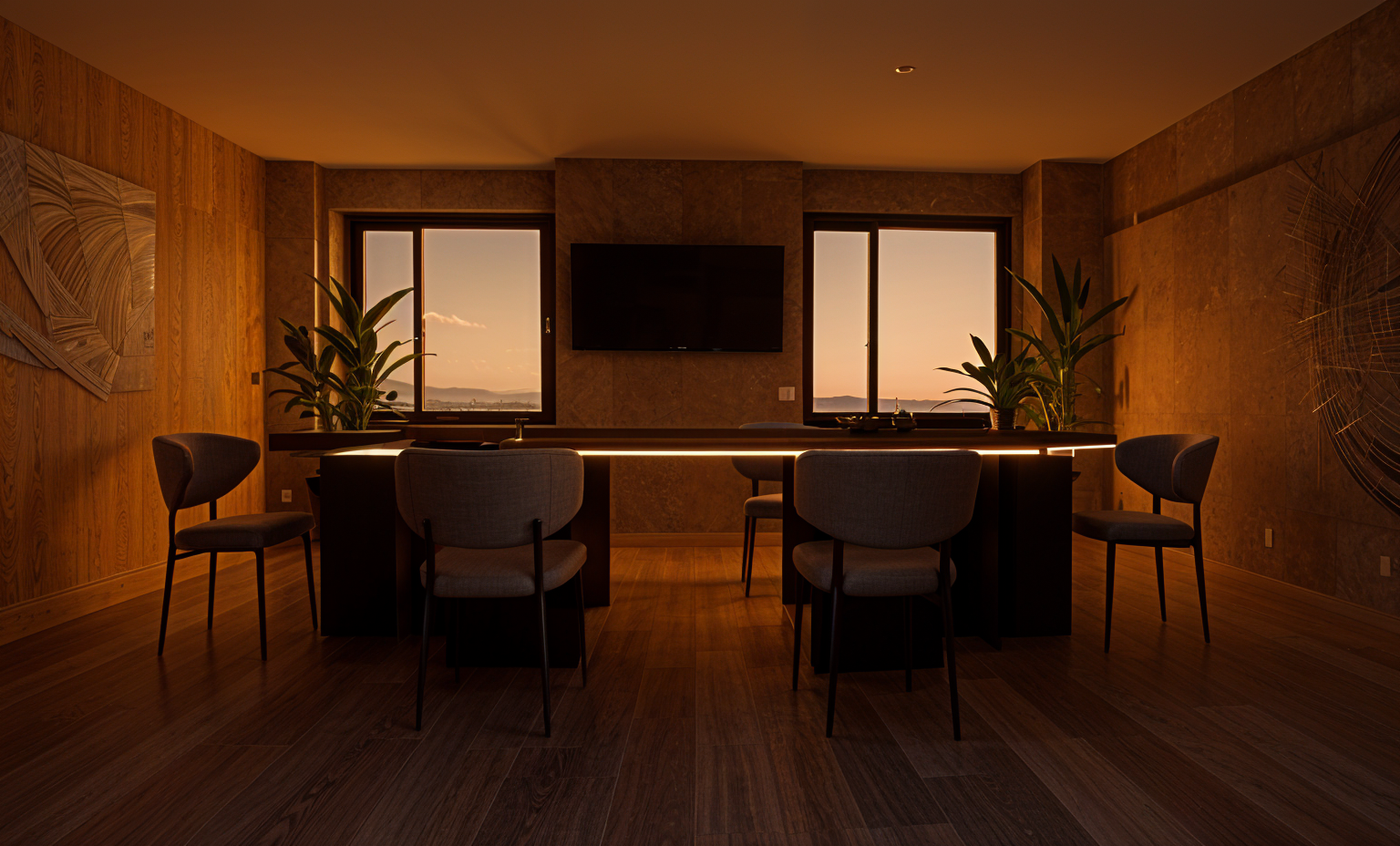 modern building at the low mountains high basement forest behind buildings clear sky wooden balconies glass balustrade