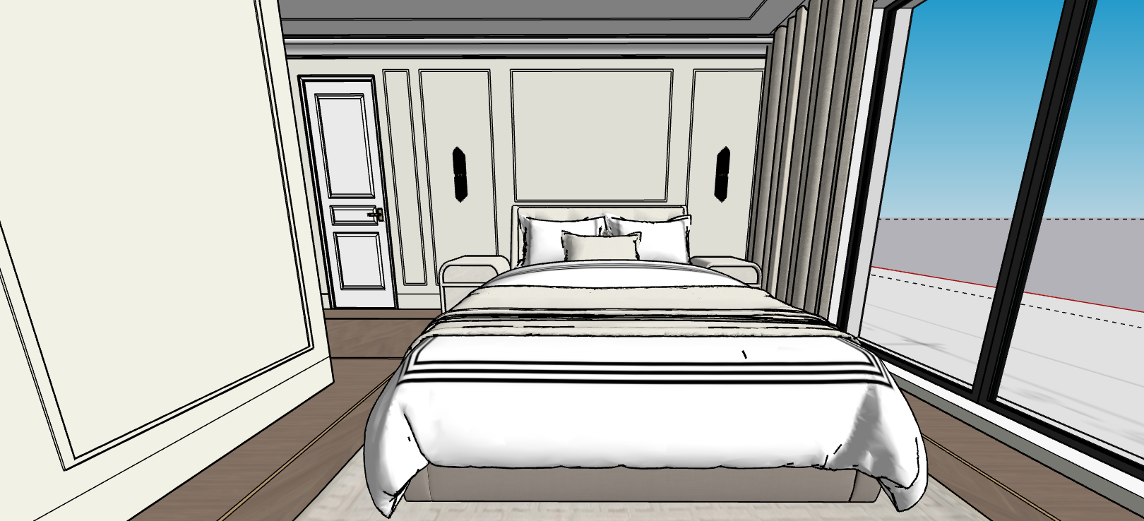 render the image the walls and trims are benjamin moore silver satin oc 26 the walls are benjamin moore chantilly lace oc 65 add 7 baseboard the window view is an upper level backyard view the nightstands are a white linen the wall scones above the nightstands are crystal with brushed gold the floor is home decorators collection sample sheffield island oak luxury vinyl flooring