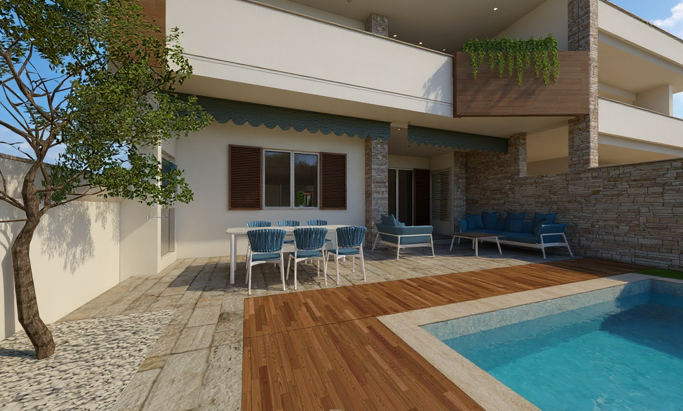 a modern minimalist villa the space is bathed in sunlight there are a few suggestive clouds in the sky