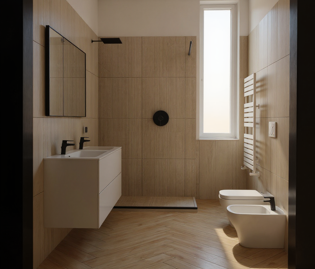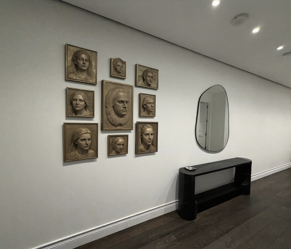 add organic sculptural wall art pieces to the left of the mirror